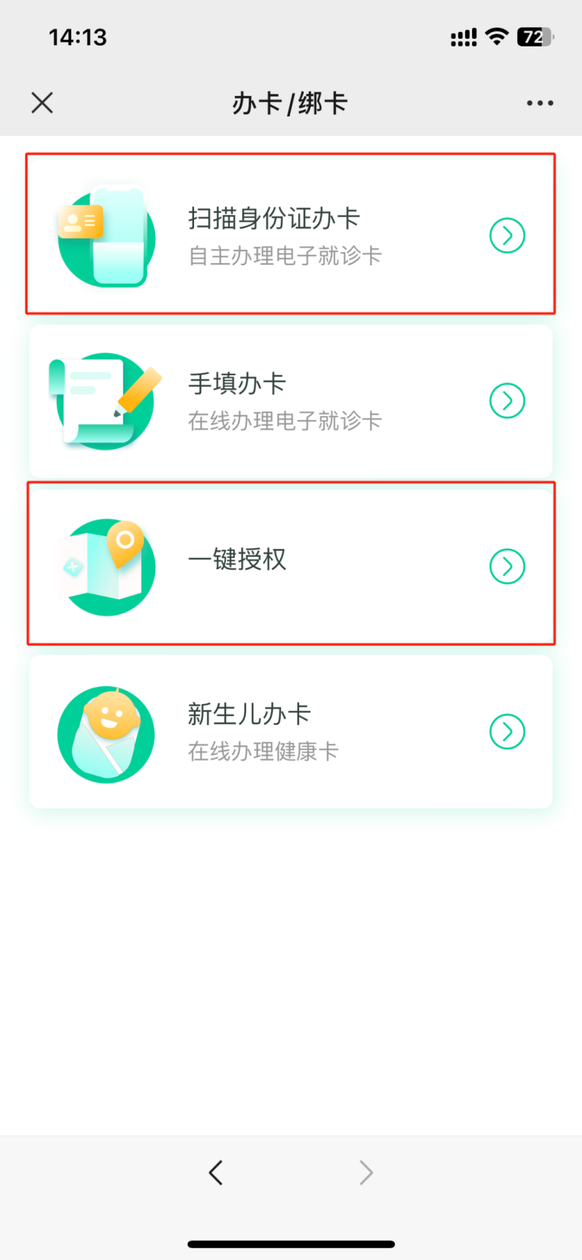 第三步:点击第一项(扫描身份证办卡)办卡/绑卡或一键授权,完善个人信息后提交。