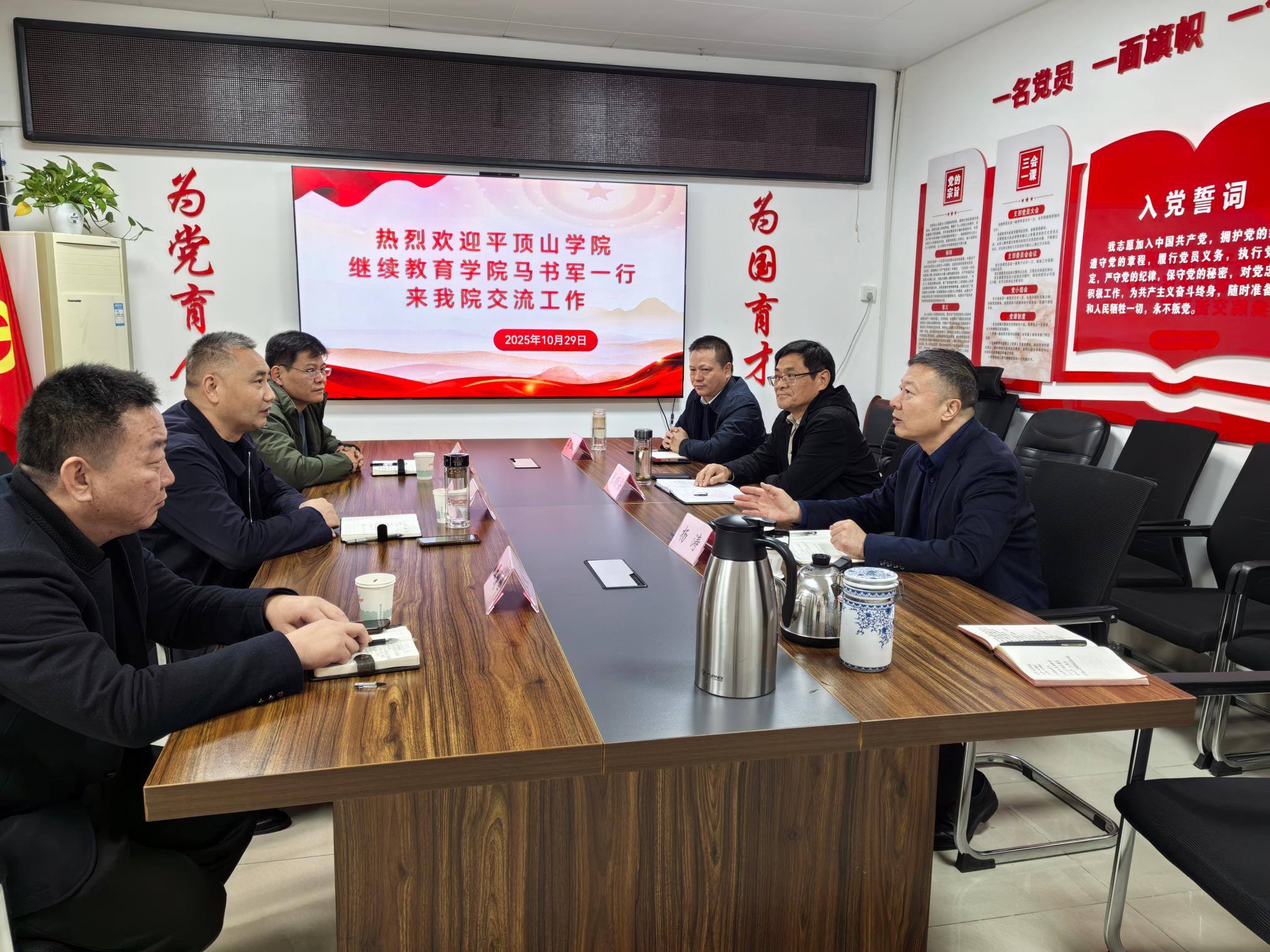 10月29日上午,平顶山学院继续教育学院院长马书军、副院长孔令春、党政办主任王峻峰一行3人来我院考察交流。