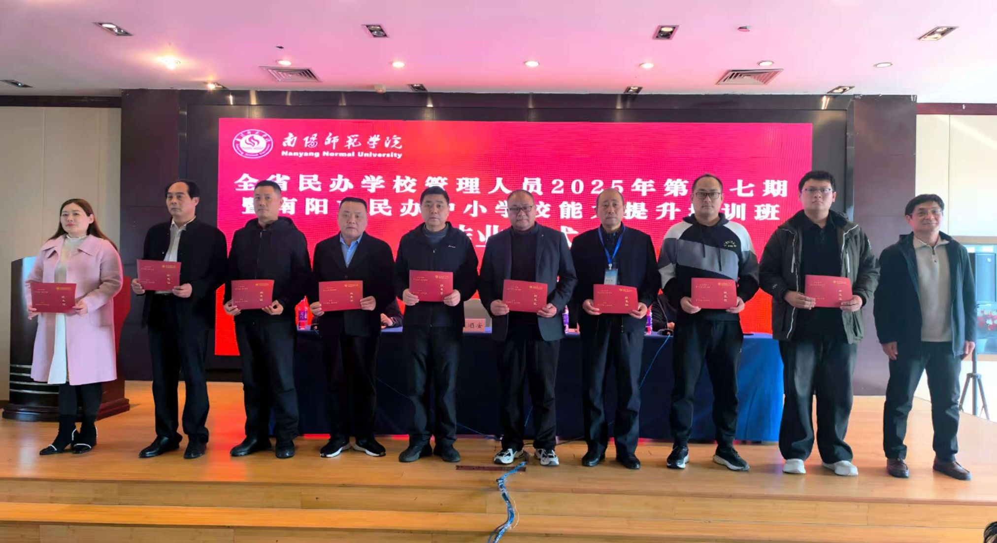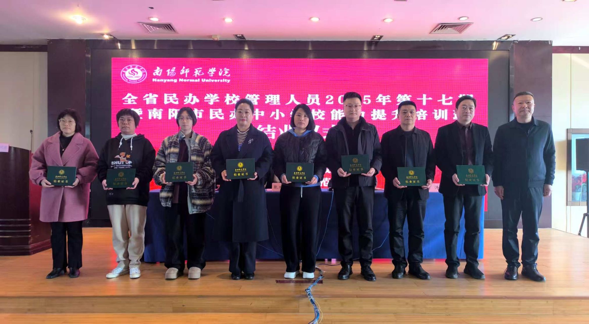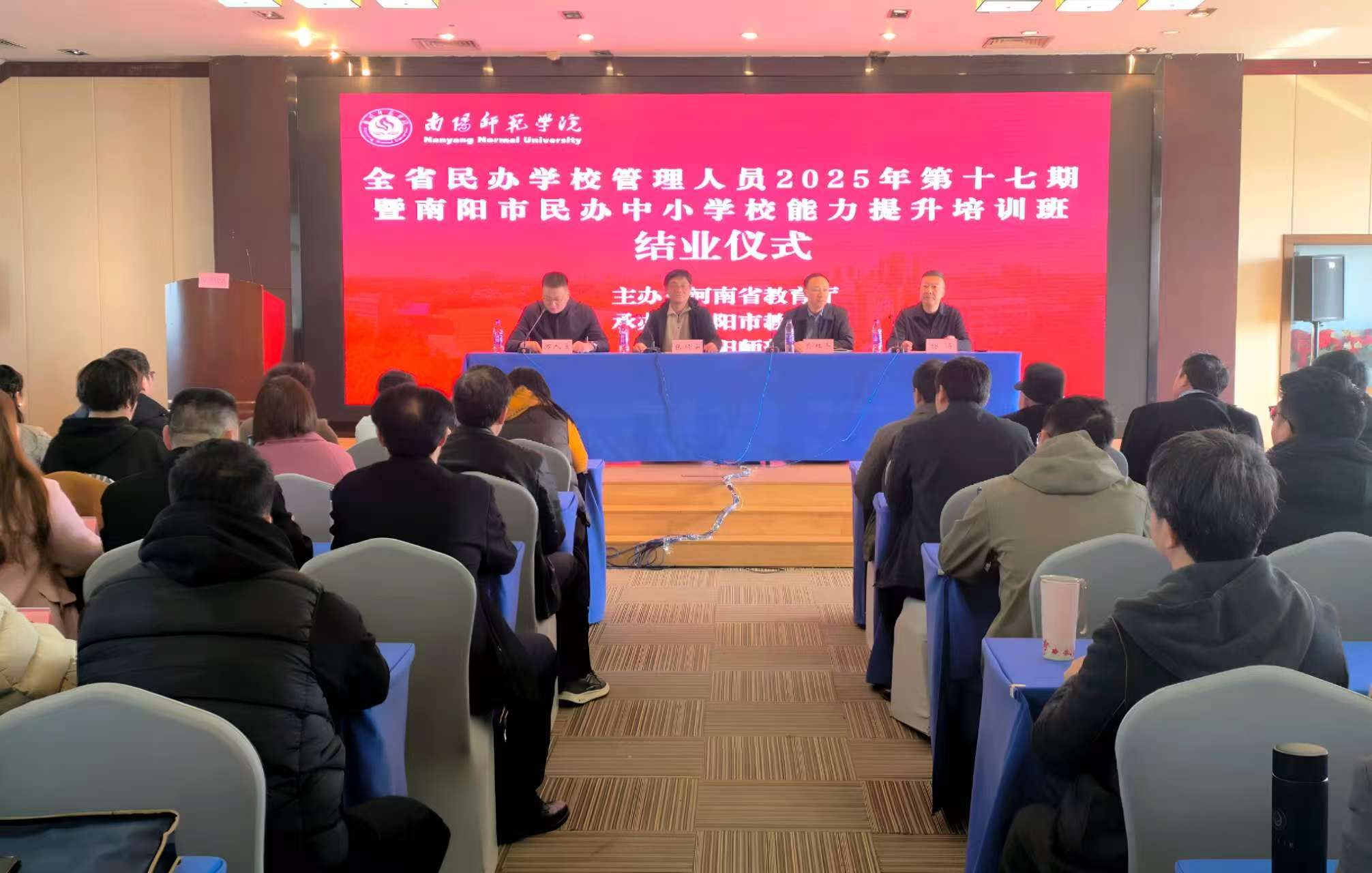 11月21日下午,全省民办学校管理人员2025年第十七期暨南阳市民办中小学校能力提升培训班结业仪式在南阳天润富瑞阁国际酒店行政楼报告厅隆重举行。南阳市教育局民办教育管理科科长俞红平,南阳师范学院继续教育学院党总支书记张顺安、院长杨涛等领导出席,南阳市120名民办义务教育学校校长、管理骨干及各相关部门负责同志参加。仪式由继续教育学院副院长万人立主持。