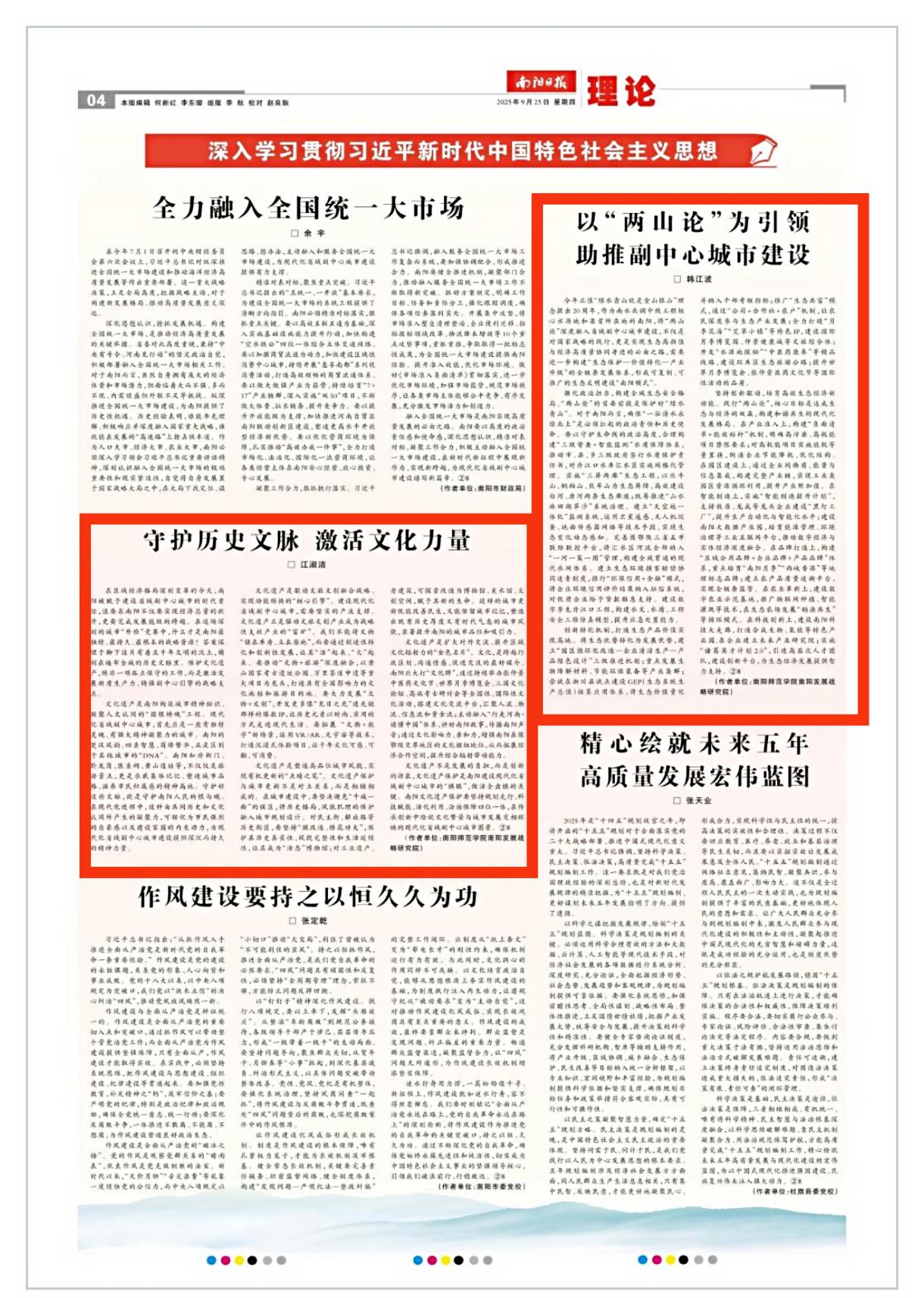 (本网讯 江淑洁 胡明静 程永存)《南阳日报》9月25日刊发我院副院长韩江波、信息情报研究所所长江淑洁署名文章《以“两山论”为引领助推副中心城市建设》以及《守护历史文脉,激活文化力量》 ,现将原文转载如下: