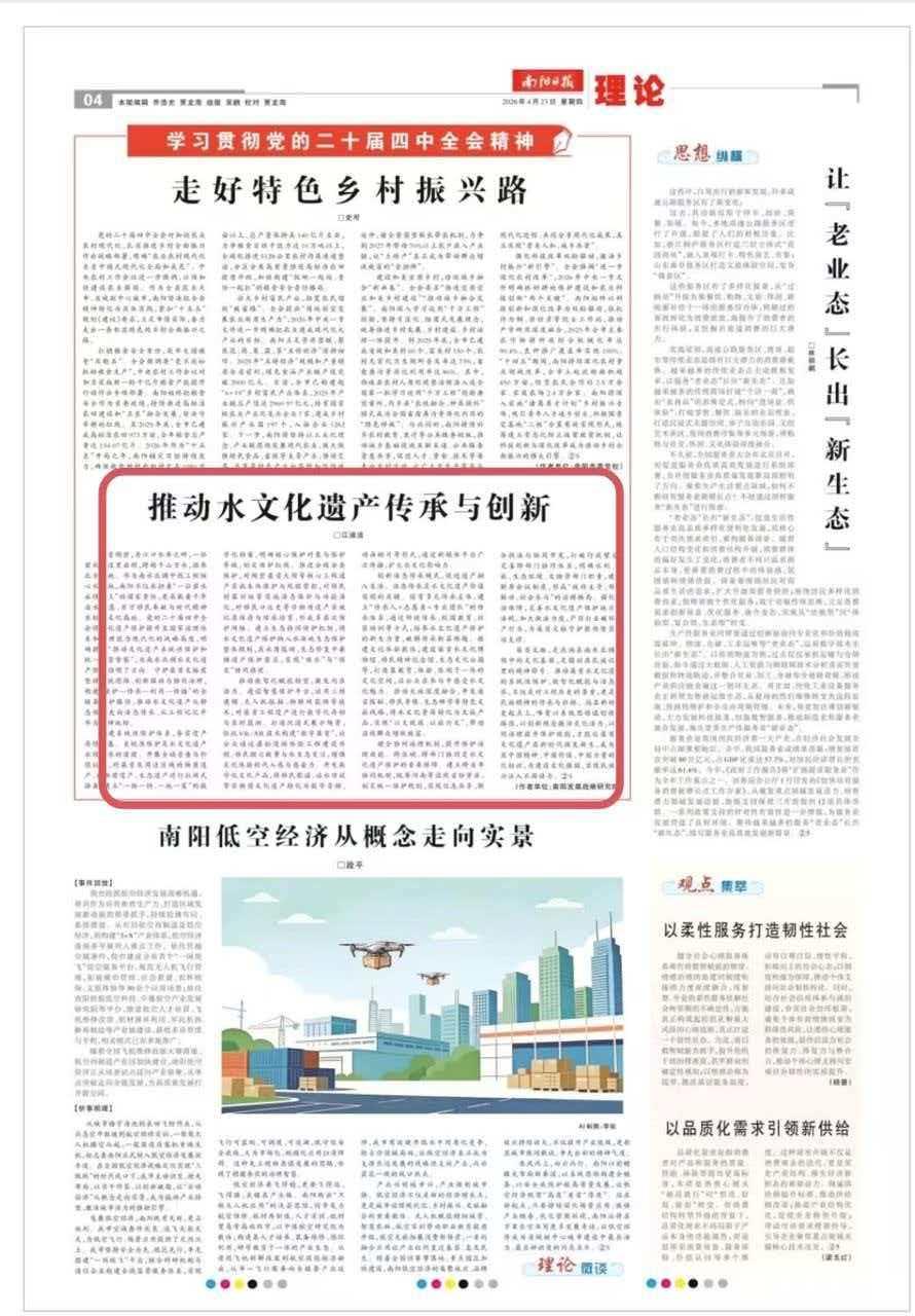 ( 本网讯 江淑洁 张涵)为深入学习贯彻党的二十届四中全会精神,推动文化遗产系统性保护与创新发展,4月23日,我院信息情报研究所所长江淑洁老师在《南阳日报》发表理论文章《推动水文化遗产传承与创新》。文中提出,南阳作为南水北调中线工程核心水源地,承载着千年治水智慧与百万移民奉献精神,需从系统性保护、数智化赋能、活态传承、协同治理等方面综合发力,构建“保护—传承—利用—传播”全链条路径,推动水文化遗产从静态保护走向活态传承,从工程记忆升华为精神地标,为南阳打造水文化高地、建设文化强市注入新动能。