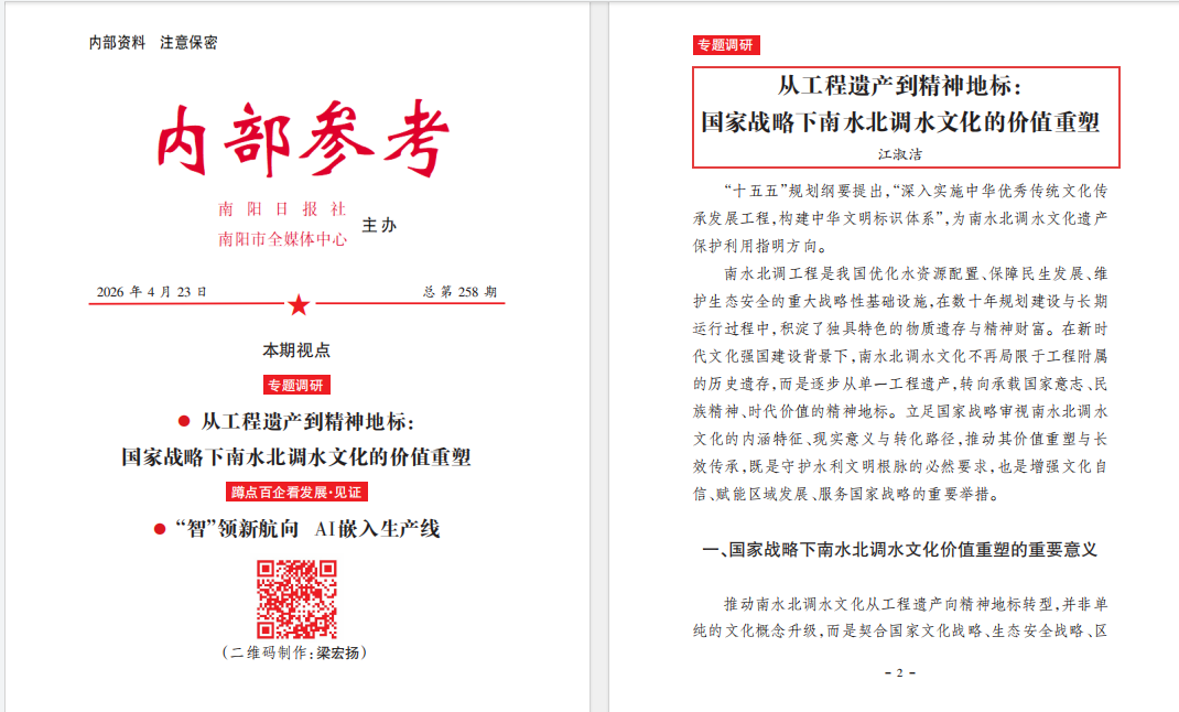 (本网讯 江淑洁 胡明静)近日,我院信息情报研究所所长江淑洁老师撰写的《从工程遗产到精神地标:国家战略下南水北调水文化的价值重塑》一文被南阳日报社内刊《内部参考》采纳。