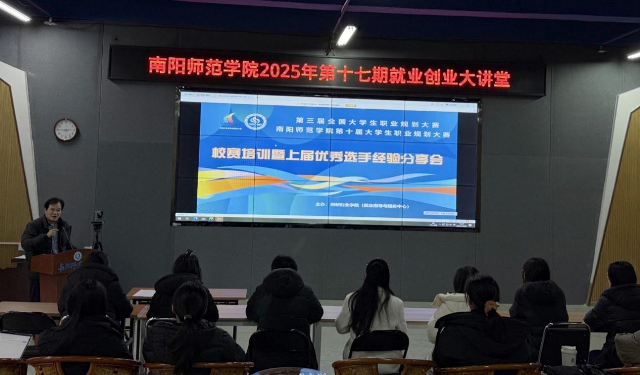 本网讯(通讯员 程文亮 图/文)为提升我校大学生职业规划大赛参赛水平与就业竞争力,12月22日,我校创新创业学院举办第十七期就业创业大讲堂。南阳市人社局大众创业导师郭勇应邀作报告,我校在第二届全国大学生职业规划大赛省赛中获奖学生代表作经验分享。我校参赛教师与学生代表共200余人参加。