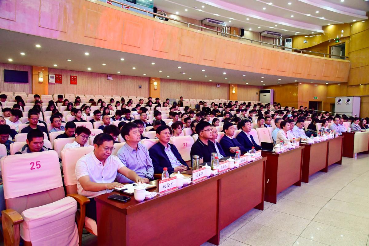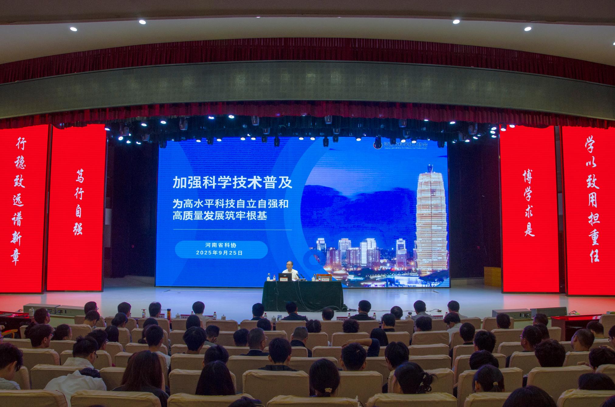 本网讯(王鹏飞 张淼/文 张家好/图)9月25日上午,河南省科协党组书记尹洪斌在河南省科协科普部部长王红松、南阳市科协主席杨富红陪同下来校作题为《加强科学技术普及 为高水平科技自立自强和高质量发展筑牢根基》的专题报告。校领导张宝锋、罗永松、刘红林、刘守勇、熊新忠、谢海泉、刘金江、冷枫、姚伦广以及我校师生代表共500余人参加。报告会由校党委书记张宝锋主持。