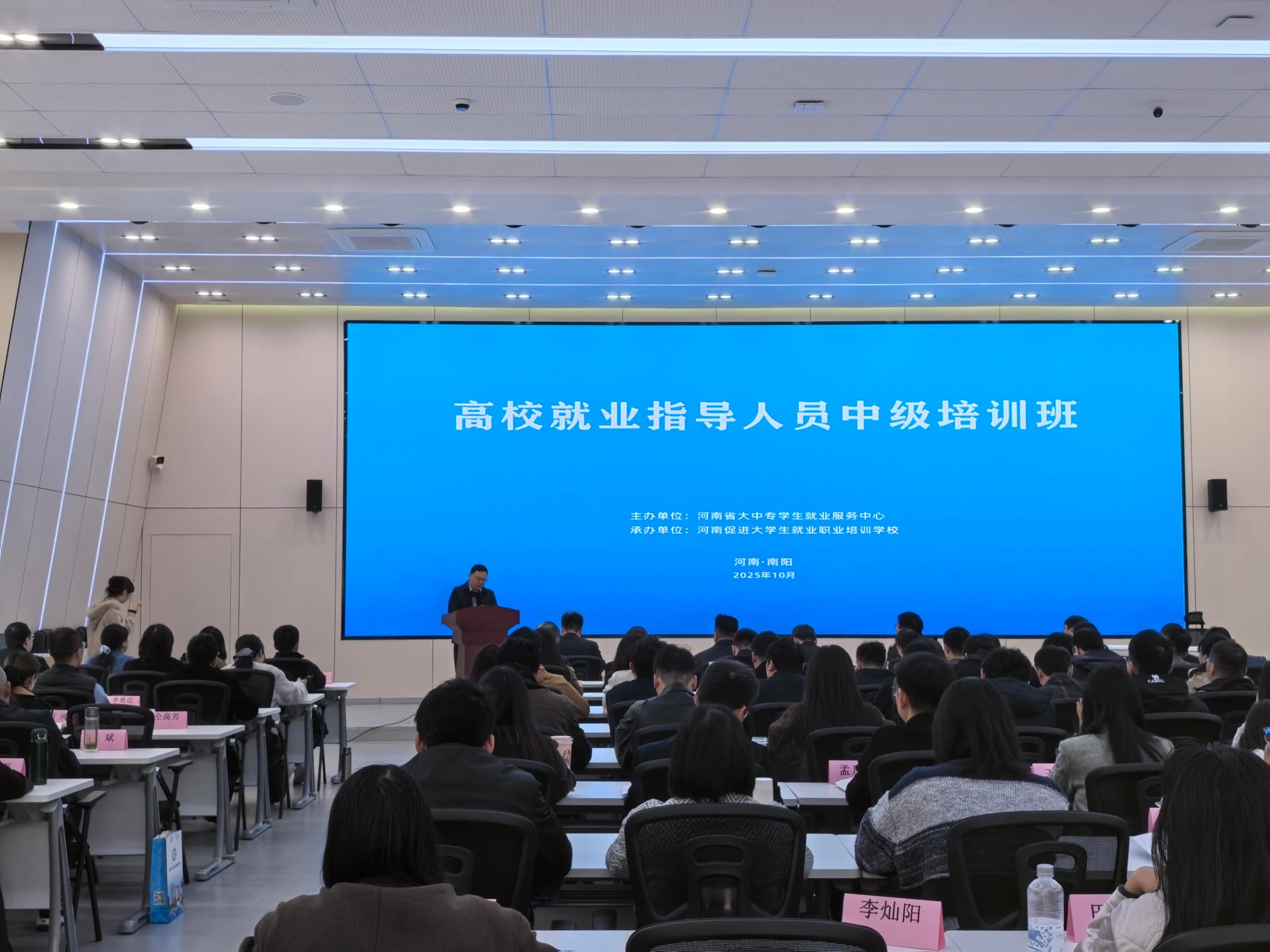 本网讯(通讯员 闫沛喆 图/文)10月30日-11月2日,由河南省大中专学生就业服务中心主办,河南促进大学生就业职业培训学校承办的教育部“高校就业指导人员中级培训班”在我校科技大楼一楼报告厅举办。副校长冷枫出席开班仪式并致辞,河南省47所高校117名就业指导教师参加培训。