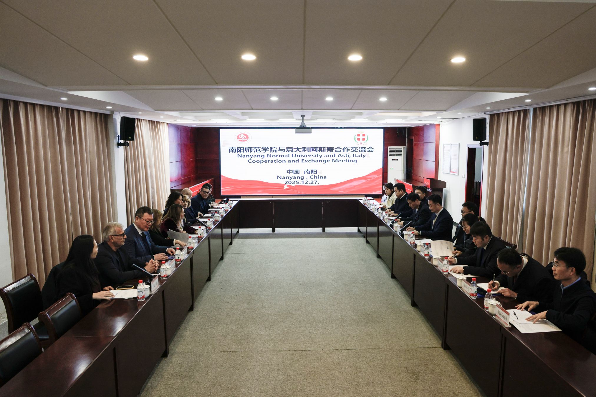 本网讯(王广琦/文 阮子涵 闫丽颖/图)12月27日,以意大利阿斯蒂市副市长洛蕾塔·博洛尼亚为团长的阿斯蒂市代表团访问南阳师范学院。双方围绕深化教育合作、促进青年交流等在办公大楼一楼东会议室举行座谈。南阳市政府二级巡视员李璞、市委外办外事管理科相关负责人出席会议。校长罗永松出席会议并致辞,国际交流合作处(国际教育学院)负责人及相关工作人员参加交流。会议由副校长熊新忠主持。