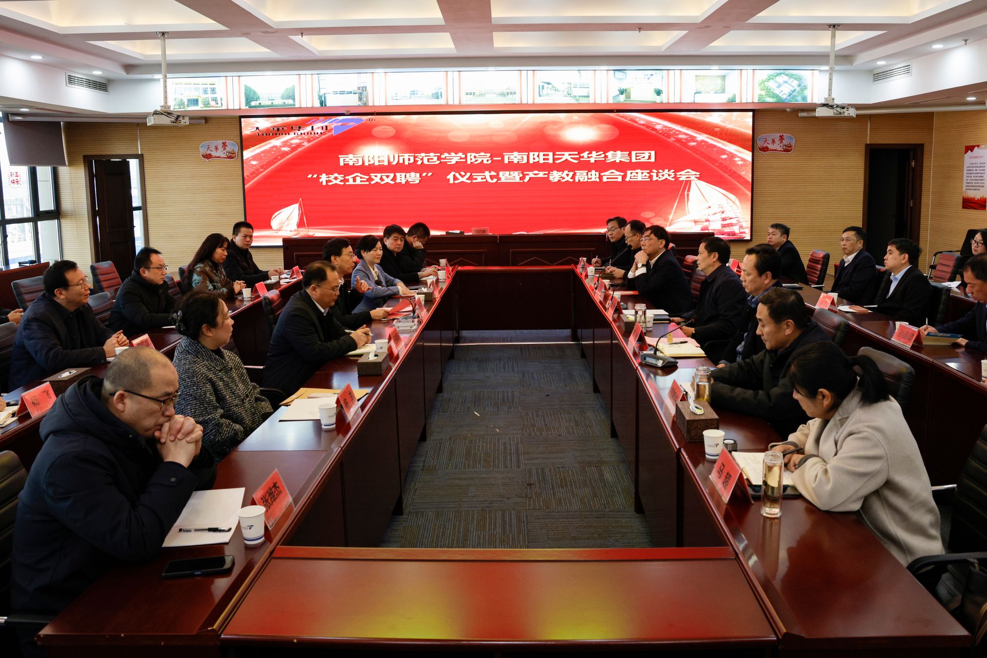 本网讯(黄群增/文 孙宏运/图)1月6日,校党委书记张宝锋、副校长王岩带队赴南阳天华集团,出席“校企双聘”仪式暨产教融合座谈会。南阳市委组织部二级调研员杨美出席活动并致辞。南阳相关市直单位和卧龙区有关负责同志,南阳天华集团董事长王峰、副总裁孙国印等参加活动。卧龙区委常委、组织部部长李耀主持座谈会。
