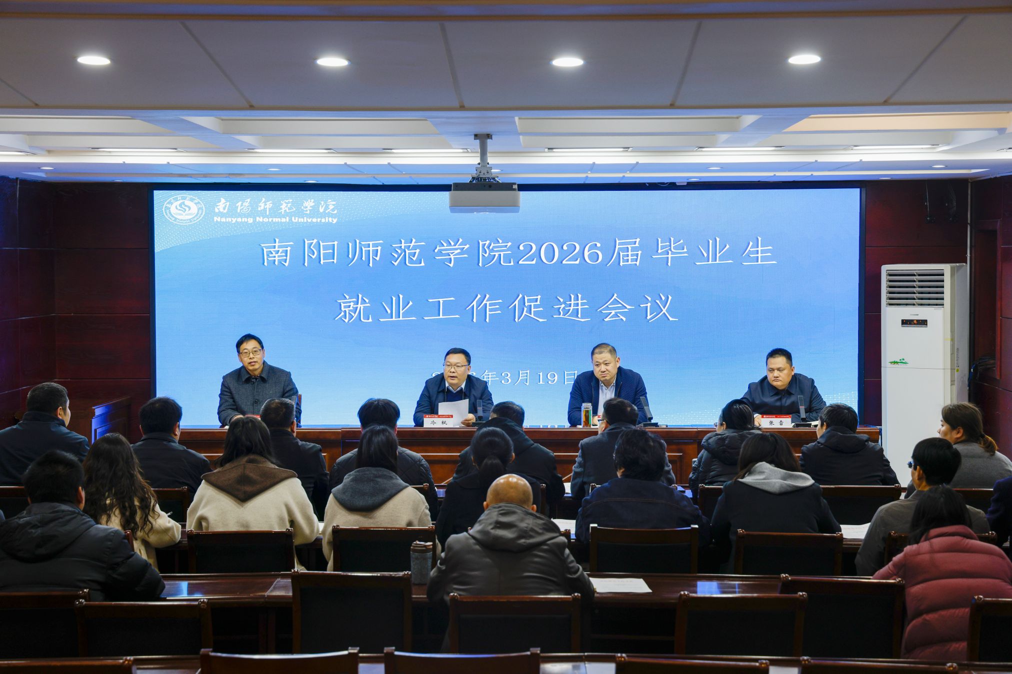 本网讯(闫沛喆/文 孙宏运 谭博文/图)3月19日上午,我校在办公大楼一楼东会议室召开2026届毕业生就业工作促进会议。副校长冷枫出席会议并讲话。各二级学院党委副书记,创新创业学院相关人员参加会议。
