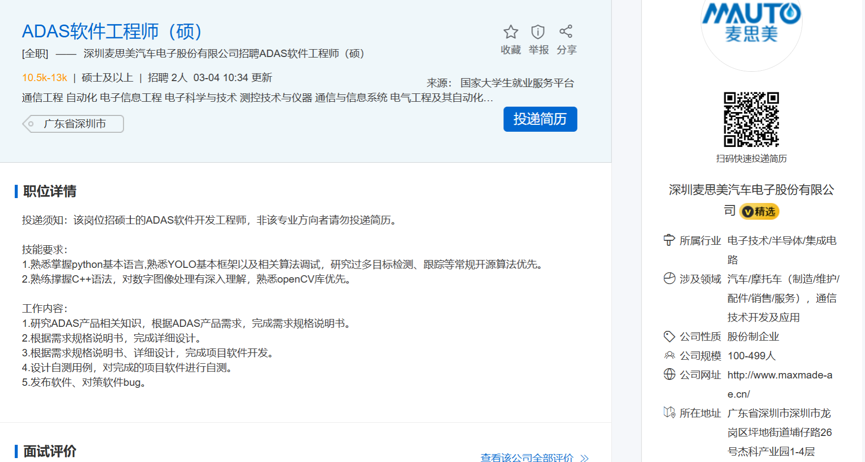 深圳麦思美汽车电子股份有限公司招聘ADAS软件工程师(硕)