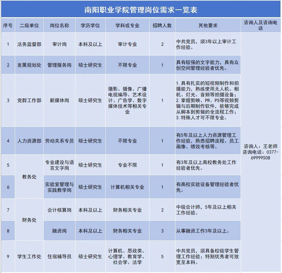 行政管理岗:涉及发展规划处、人力资源部、法务监督部、教务处、财务处等核心部门,负责统筹协调、政策落实等管理工作。