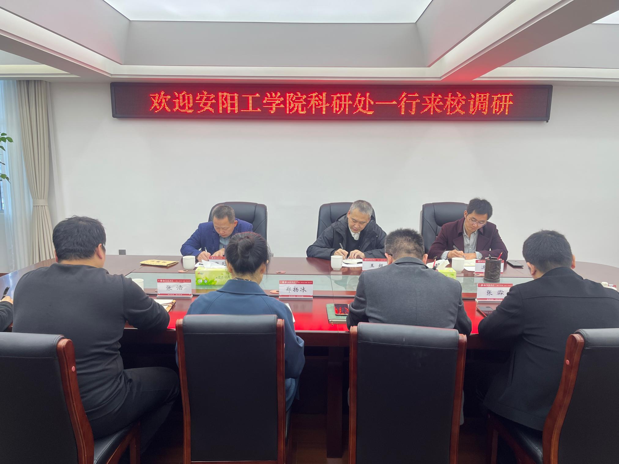 李亭对王超一行的到来表示热烈欢迎,并系统介绍了我校在科研项目管理、创新平台建设、高水平成果培育及服务地方发展等方面的举措与成效。王超对我校科研管理工作取得的成果表示赞赏,并介绍了安阳工学院科研工作的基本情况与发展规划。他表示,希望以此次交流为起点,建立两校科研部门常态化互动机制,通过互学互鉴,推动共同发展。