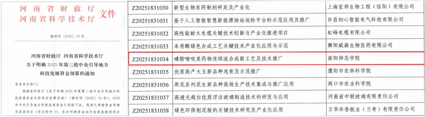 本网讯(通讯员 杨仕伟 张 浩)近日,河南省科技厅发布了2025年度河南省中央引导地方科技发展资金项目立项的通知。我校化学与制药工程学院绿色催化团队联合河南全宇制药股份有限公司申报的“磺胺嘧啶类药物连续流合成新工艺及技术推广”项目批准立项,资助经费60万元,是我校面向应用基础研究与产业关键技术攻关取得的重要进展。