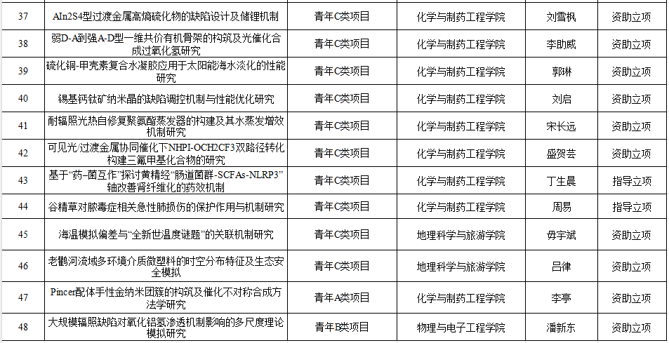河南省自然科学基金获批立项48项,其中青年A类项目(原省杰青)1项,青年B类项目(原省优青)1项,面上项目24项,青年C类项目22项;获经费资助39项,获批经费达到355万元,立项总数、经费资助项目数与获批经费数均创历史新高,在省内师范类高校名列前茅。截至目前,我校共有2人获批青年A类项目,8人获批青年B类项目,高层次人才类项目立项稳步突破,科研梯队建设成效显著。此外,我校3个河南省国际科技合作项目(培育项目)获批立项,其中获经费资助2项,获批经费20万元。