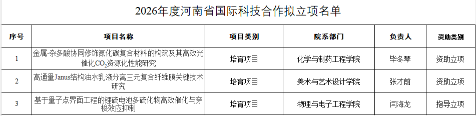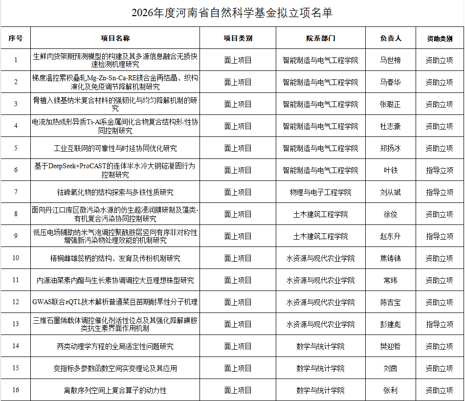 本网讯(通讯员 张浩 郑扬冰)近日,河南省科技厅发布了2026年度河南省自然科学基金和2026年度河南省国际科技合作项目拟立项名单,我校共有51个项目获批立项。