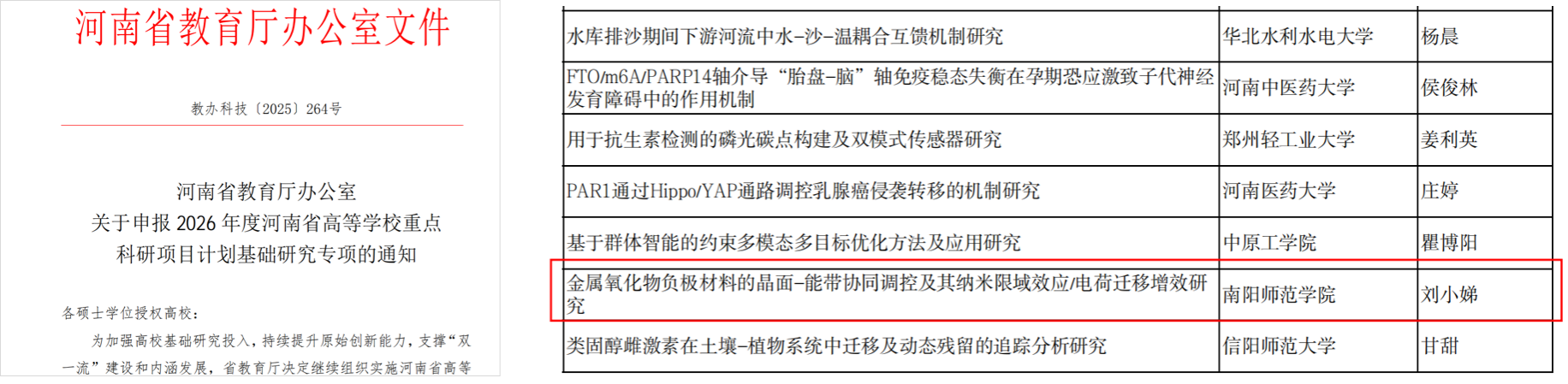 本网讯(通讯员 杨仕伟 张 浩)近日,河南省教育厅发布了2026年度河南省高等学校重点科研项目计划基础研究专项立项名单的通知,由化学与制药工程学院刘小娣老师主持申报的“金属氧化物负极材料的晶面-能带协同调控及其纳米限域效应/电荷迁移增效研究”批准立项,资助经费30万。这是我校首次获批该类项目,是学校科技创新能力提升的又一重要体现。该项目面向新能源材料前沿,聚焦电化学储能器件的关键科学问题,通过研究金属氧化...