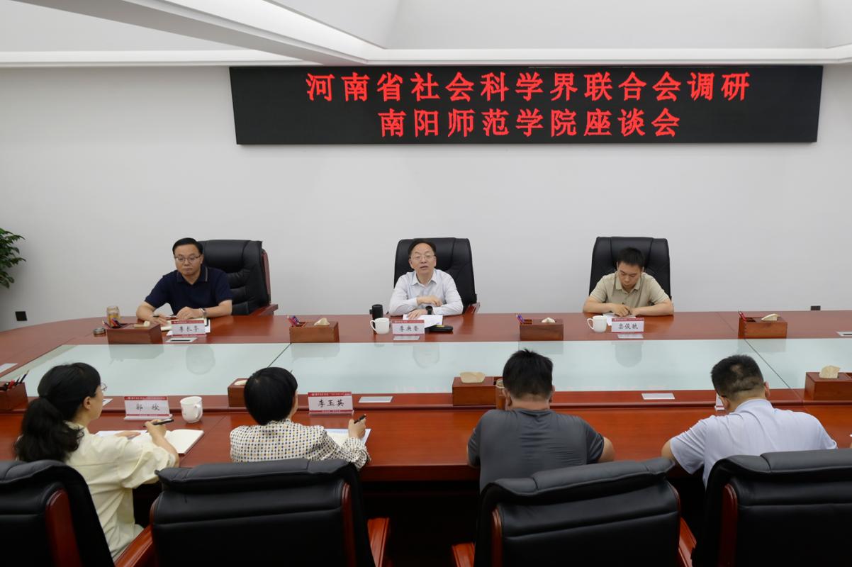 本网讯(张恒杰/文 阮子涵/图)7月4日下午,河南省社会科学界联合会党组书记、主席李庚香到我校调研,座谈会在办公大楼二楼东会议室举行。社科处、教务处、人事处、南阳发展战略研究院、文学院、马克思主义学院、 水资源与现代农业学院等单位负责人,以及文科教师代表参加座谈会。社科处处长李长亭主持座谈会。