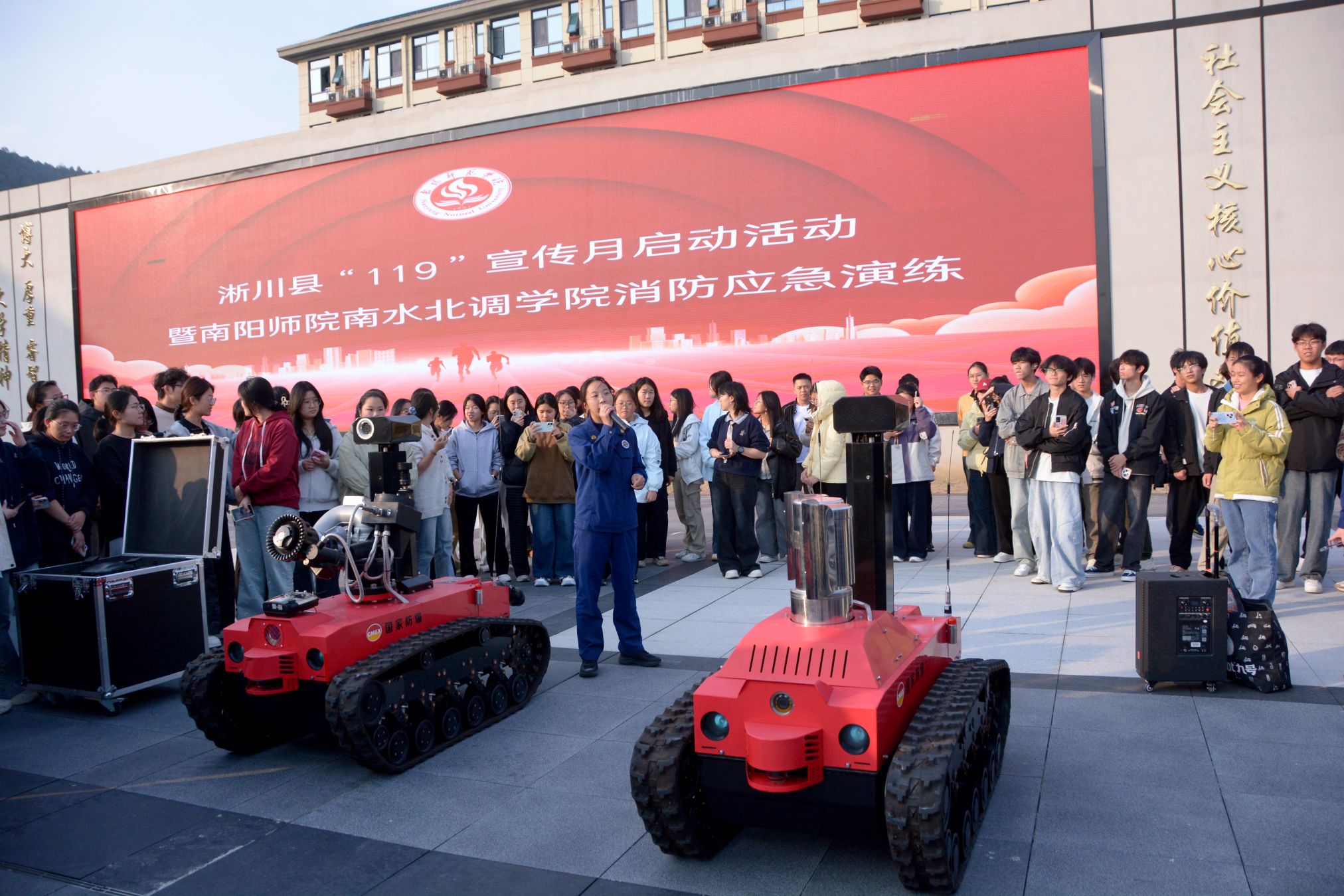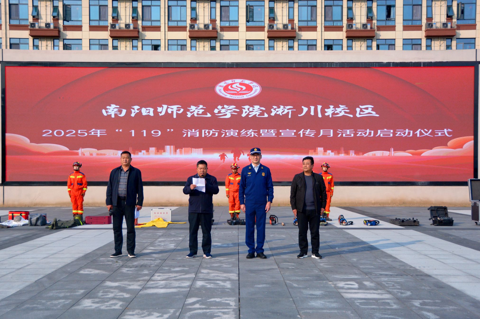 本网讯 (通讯员 赵峥 图/文)11月5日下午,在第34个全国消防日来临之际,我校淅川校区联合淅川县消防救援大队开展2025年“119”消防宣传月启动仪式暨灭火应急实战演练,校区消防安全重点单位、后勤安全工作负责人、各学院安全工作负责人、重点部位、重点岗位责任人及师生代表参加。活动由丹水书院书记院长张贺龙主持,校区党工委副书记、管委会副主任吴春刚致辞并宣布活动启动。
