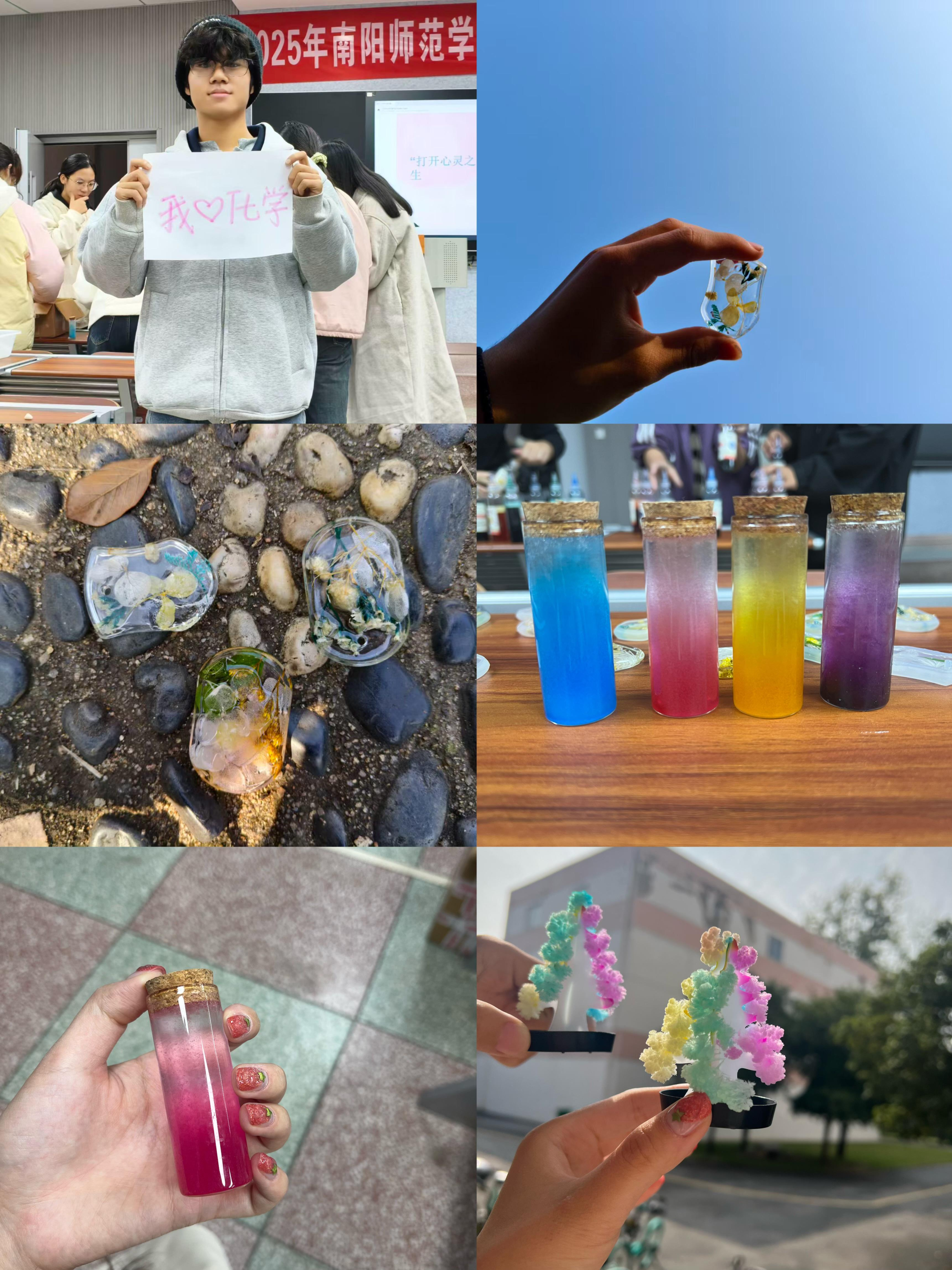 活动现场共设有多个体验区域,融合化学知识与心理调适于一体,引导同学们在动手实践中感受情绪流动与心灵沉淀。在“凝时成珀”活动区,参与者将干花等嵌饰摆放进模具,缓缓注入树脂并搅拌消泡。静置固化,待树脂完全凝固,脱模后,一件件独一无二的“时光琥珀”逐渐呈现,仿佛将美好瞬间定格其中,同学们共同见证“时光宝石”诞生,感受自然与工艺的结合之美与心灵的平静。“引液攀升,静待花开”环节则展现了毛细现象与结晶之美。大家将纸卡拼接成树形,倒入特制溶液,静静等待毛细现象与结晶作用带来的奇迹,看着彩色晶体如雪花般在“树枝”上绽放,同学们发出阵阵惊叹,在等待中感受耐心与期待的意义。“ 吸水凝晶,幻雪生春”体验则让现场秒变“冬日乐园”,吸水树脂遇水膨胀成蓬松雪状,营造出轻松愉快的氛围,欢声笑语不断。在“隐墨现影,秘语传情”巧妙运用化学原理传递情感。同学们用无色酚酞在纸上写下密语,然后用碳酸钠溶液喷洒在纸上,密语悄然出现,不仅呈现出神奇的化学现象,也寓意情感与心绪在关怀中得以显现与传递。最终,整场活动在温馨欢快的氛围中圆满落幕。