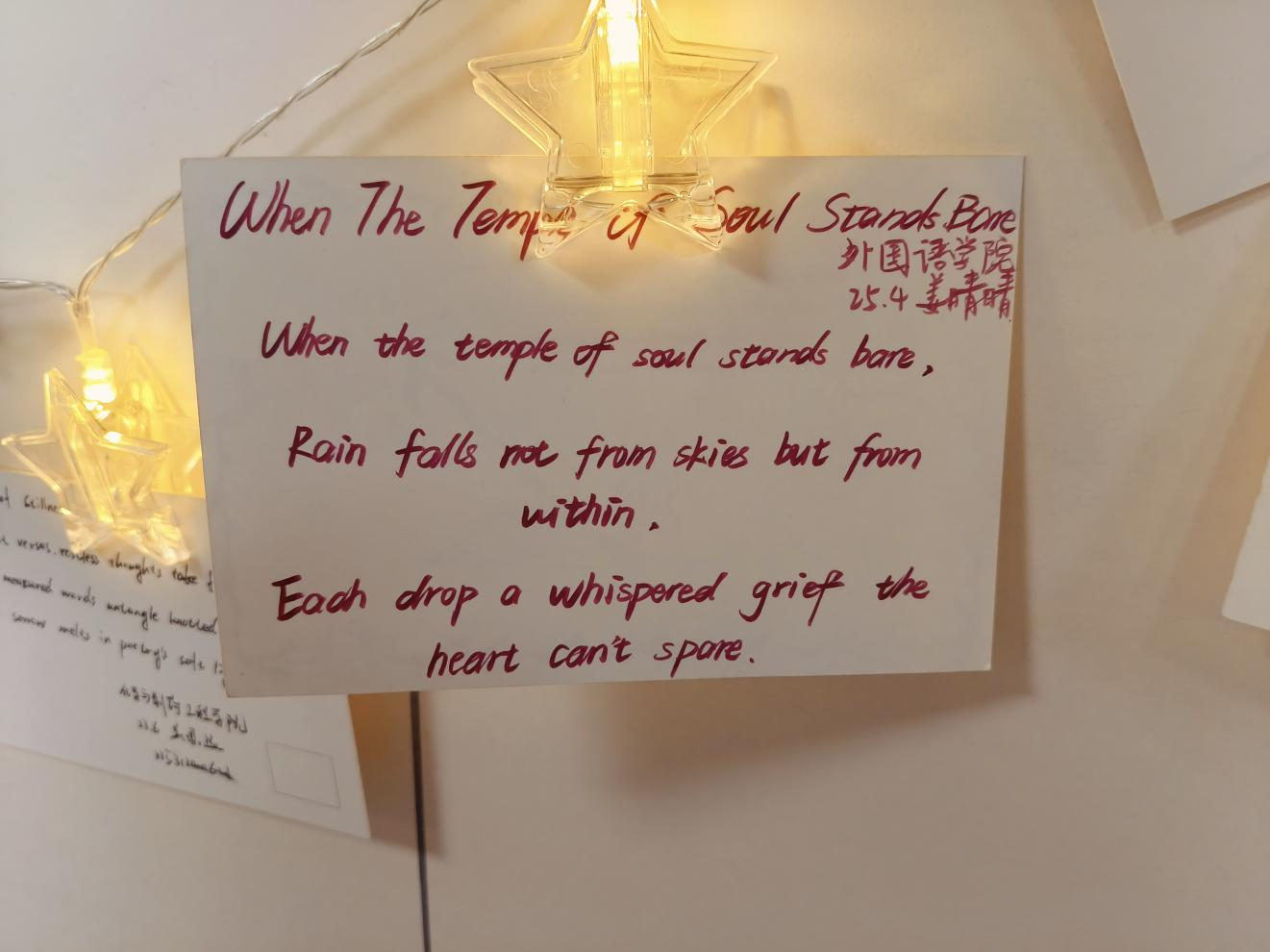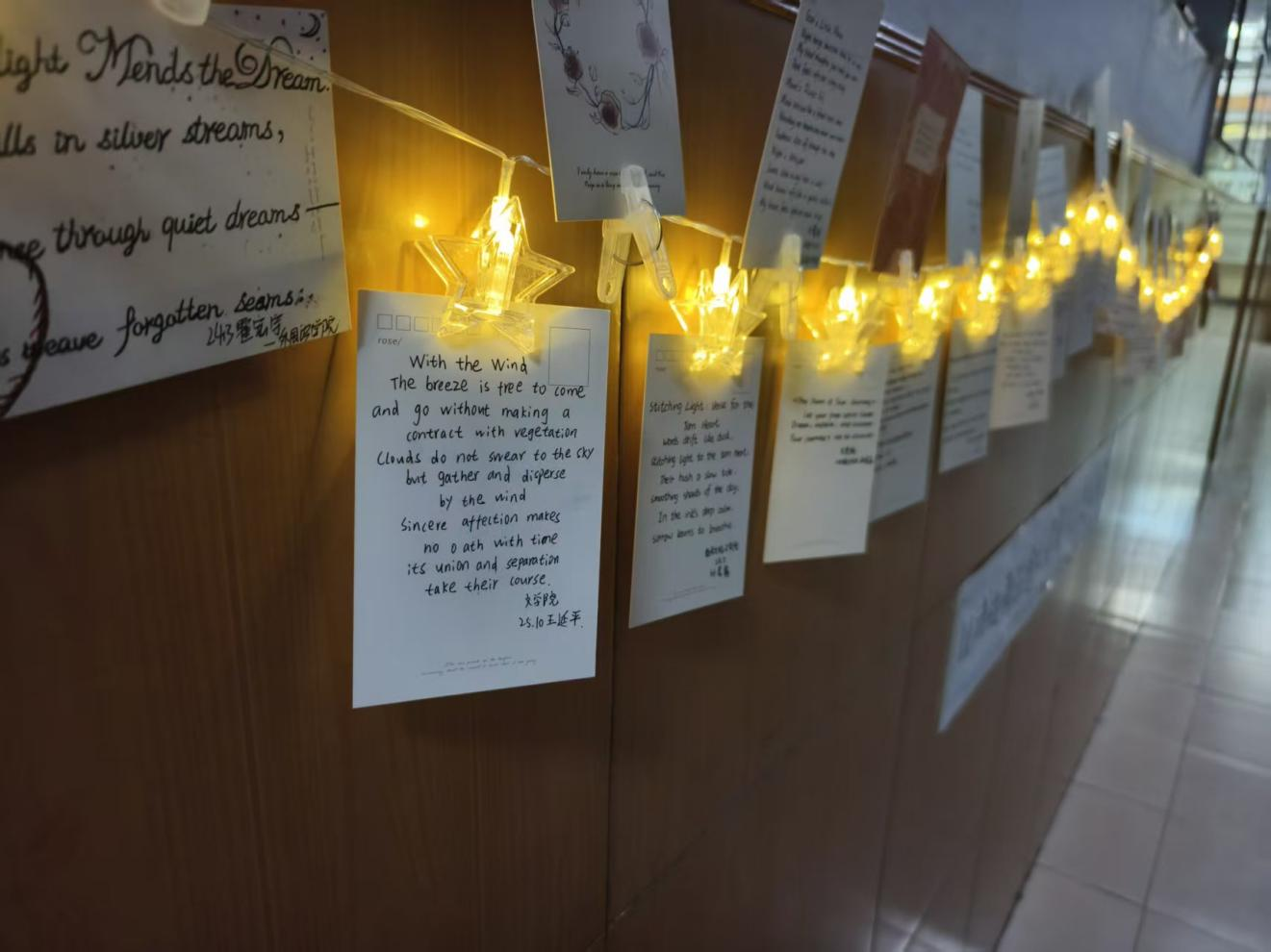 展览现场以暖光装饰营造治愈氛围,每幅作品都承载着创作者的真挚情感与文学巧思:既有对内心情绪的细腻描摹,也有对生活温柔的诗意解构,既展现了学生的语言表达能力,也实现了“以诗抒情、以文暖心”的初衷。活动后期,优秀作品还通过“外苑微语”公众号推送展示,进一步扩大了心理健康宣传的辐射范围。