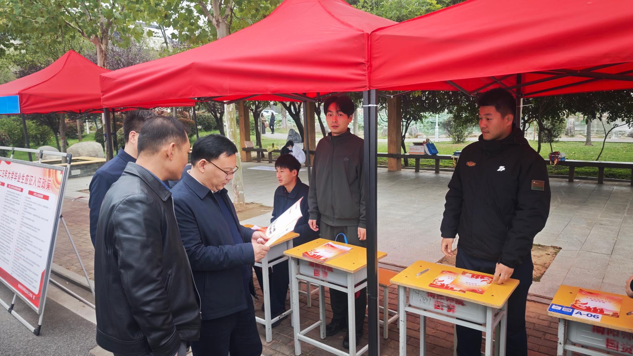 本网讯(通讯员 许海滨)为扎实做好学校国防教育及征兵宣传工作,鼓励大学毕业生积极参军报国,踊跃献身国防,10月24日上午,校人民武装部以毕业生双选会为契机,在双选会会场开展征兵政策宣传活动。副校长冷枫到征兵宣传现场指导。