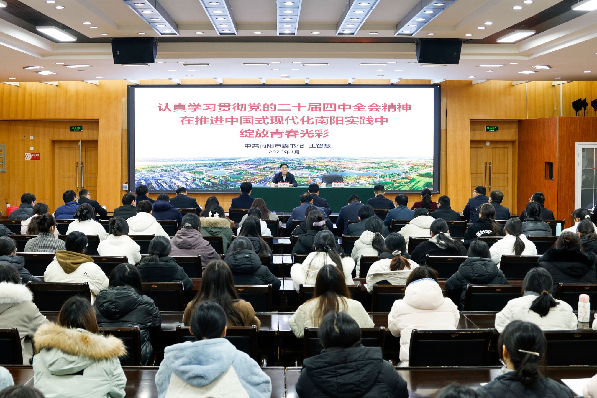 本网讯(王一鸣/文 闫丽颖 伍琦琪/图)1月8日上午,南阳市委书记王智慧在科技大楼三楼会议室为我校师生讲授题为《认真学习贯彻党的二十届四中全会精神,在推进中国式现代化南阳实践中绽放青春光彩》的思政课。市委常委、统战部部长范勇,我校全体校领导、党委办公室、院长办公室、马克思主义学院师生代表参加。校党委书记张宝锋主持。