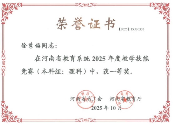 8月29--31日,由河南省总工会、河南省教育厅联合举办的河南省教育系统2025年度教学技能竞赛现场决赛在洛阳理工学院举行。经过校内选拔、省初赛(教学视频评审)层层选拔,我院徐秀梅老师脱颖而出,挺进高校理科全省前20强,顺利入围全省教学技能竞赛现场决赛,荣获全省高校理科一等奖。