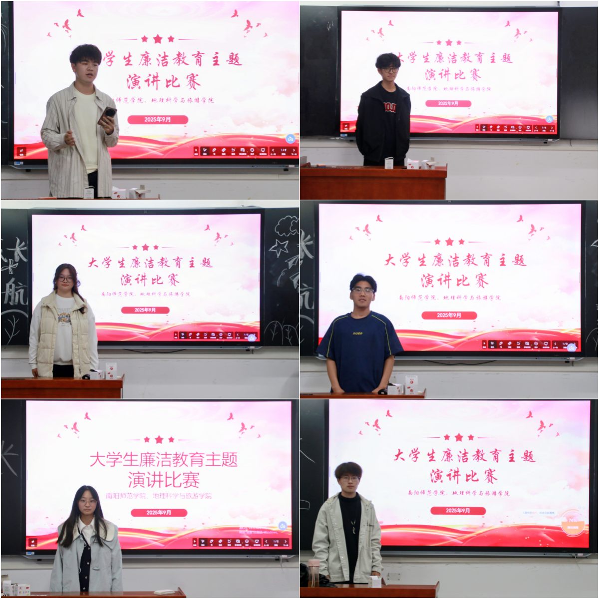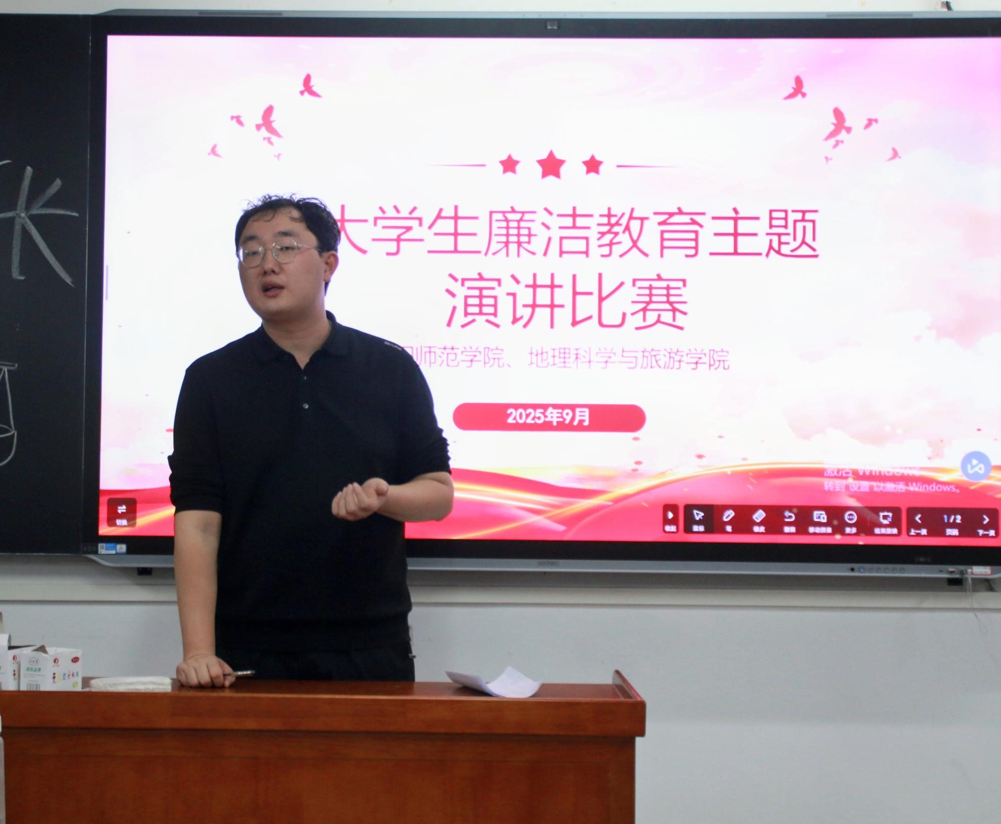 本网讯(通讯员钱启明/文 王芸蕾/图)为深入推进校园廉洁文化建设,引导大学生树立正确的价值观与道德观,筑牢青年学子廉洁自律的思想防线,地理科学与旅游学院于9月26日在逸夫楼N305开展大学生廉洁主题演讲比赛。25级辅导员叶旭主持,25级全体新生参加。