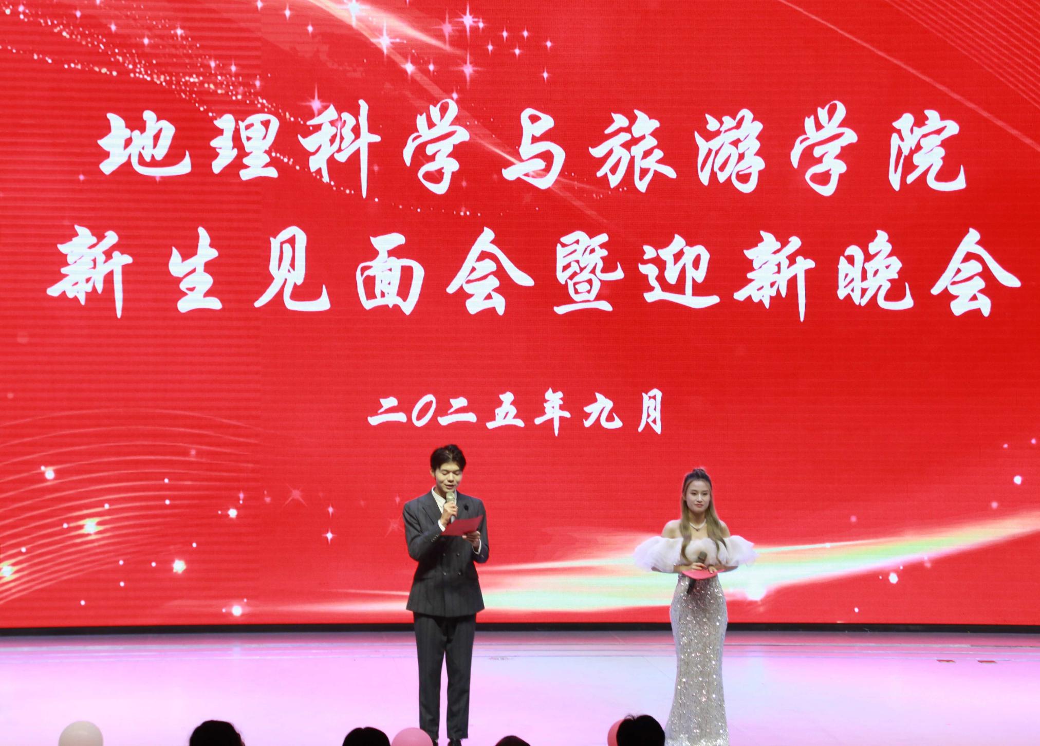 本网讯(通讯员钱启明/文 王芸蕾/图)为迎接2025级新生的到来,助力同学们加深对大学生活的认知,打造惬意欢快的大学氛围,地理科学与旅游学院于9月27日在中区演播厅举行2025级新生见面会暨迎新晚会。学院党委书记王蓬、院长鲁丰先、党委副书记程果、副院长戚鹏程、副院长杨杰、副院长张杰云、遥感技术与应用研究院院长苏博莅临晚会,各教研室主任、辅导员、25级全体新生参加。