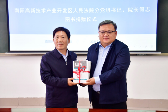 2025年9月24日,南阳高新技术产业开发区人民法院分党组书记、院长何志一行来校向我院捐赠法律图书,图书捐赠仪式于逸夫楼N203会议室举行。法学院党委书记黄维、副院长胡晓涛、党委副书记赵文博、副院长翟明煜、副院长叶赟葆及师生代表参加仪式。