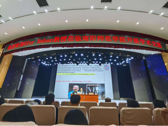 本网讯(通讯员马梦瑶/文柯子涵/图)10月16日下午,美国俄勒冈大学Ofer Raban教授应邀在南阳师范学院中区演播厅为我校师生作题为《美国法律中的谋杀罪》的学术报告,报告由法学院赵溢鑫院长主持,法学院教师及24级、25级全体学生参加。