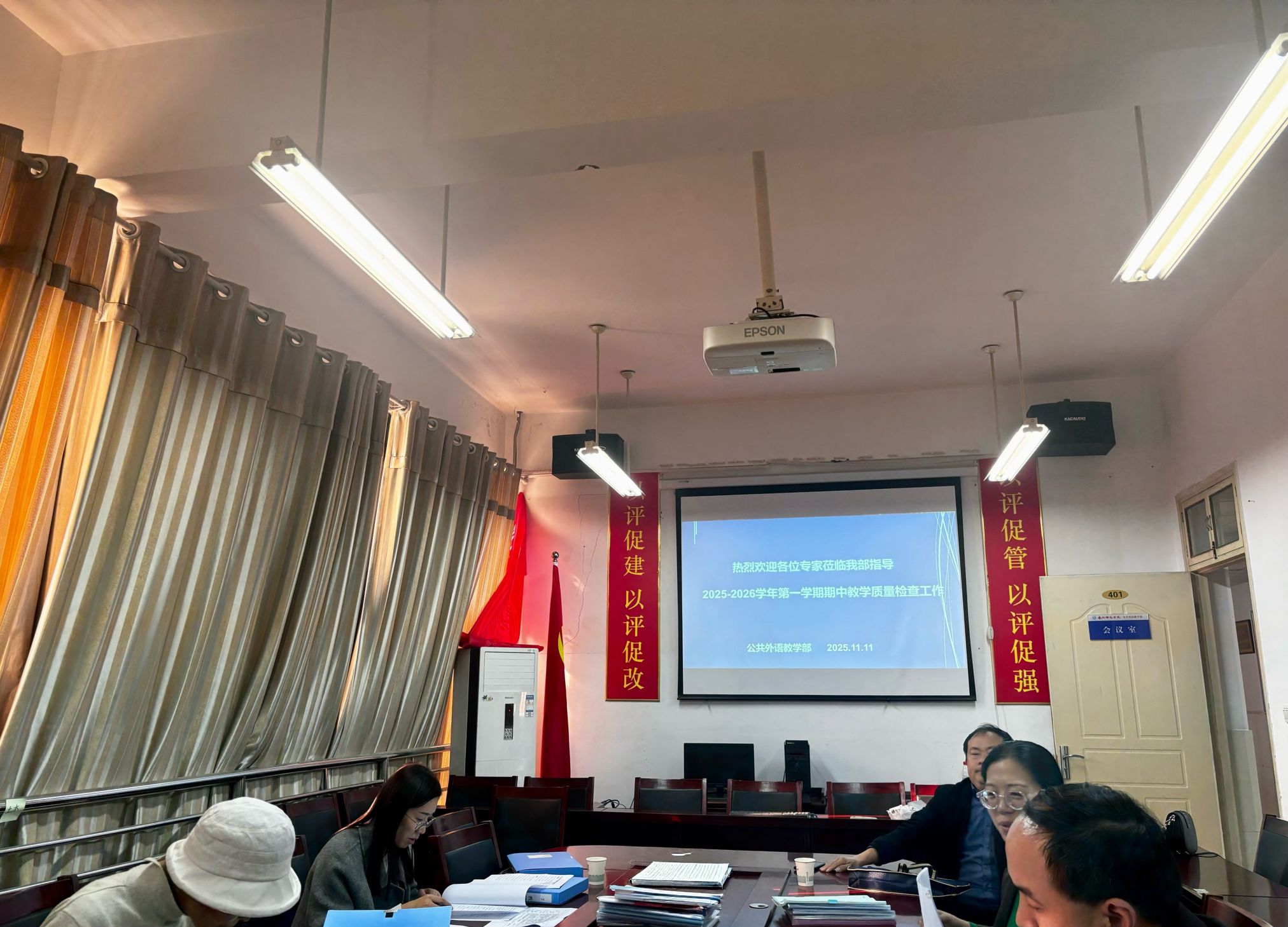 本网讯 (辛利敏/图文 )2025年11月11日,学校期中教学质量检查组专家一行深入课堂,听取了史心老师的大学英语3课程,随后赴我部检查期中教学质量检查的相关材料。