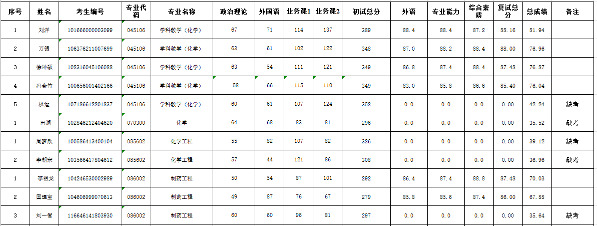 2026年化学与制药工程学院研究生第二批调剂考生成绩公示