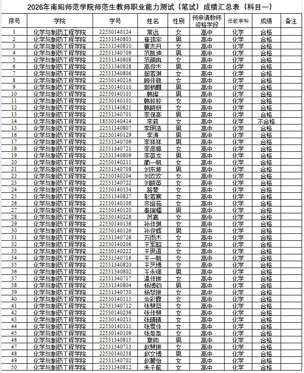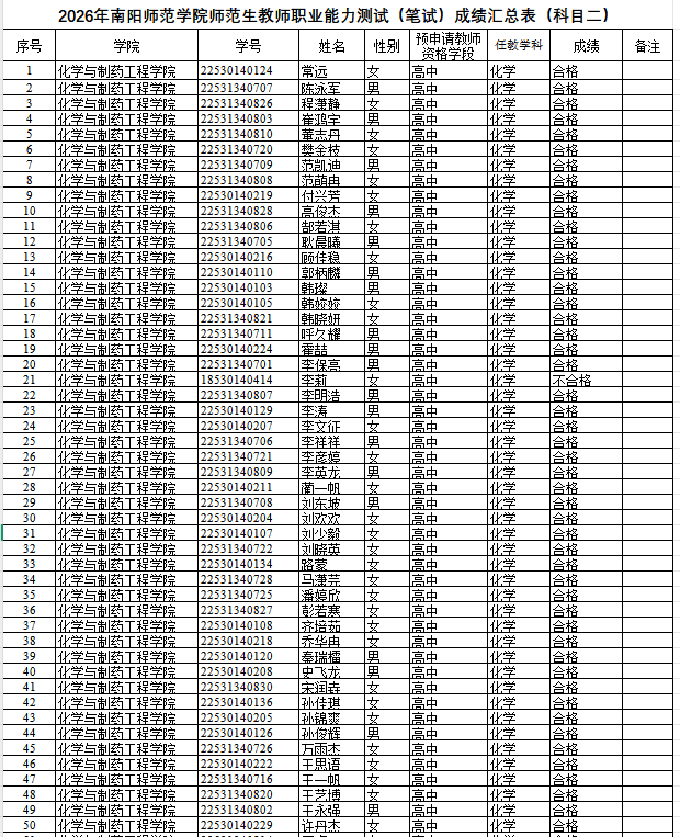 2026年南阳师范学院师范生教师职业能力测试(笔试)成绩汇总表