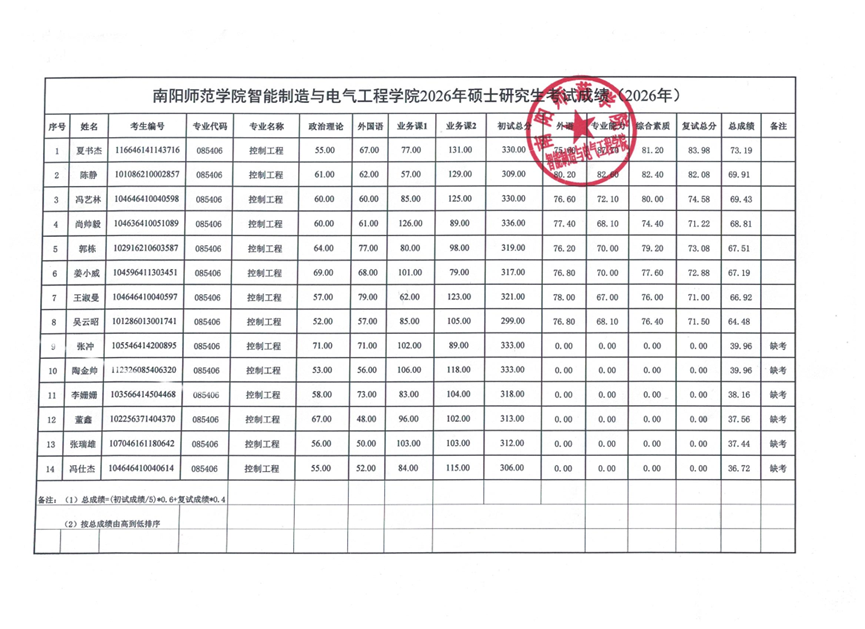 智能制造与电气工程学院2026年硕士研究生调剂考生总成绩