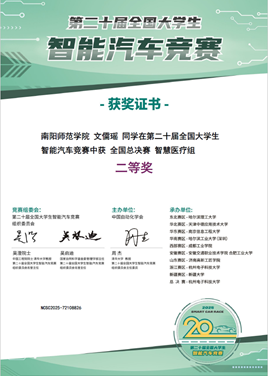 近日,我院2024级控制工程专业研究生文儒瑶在2025年中国大学生工程实践与创新能力大赛智能网联汽车组别全国总决赛中荣获二等奖,实现了我校在该赛事全国奖项上的突破。