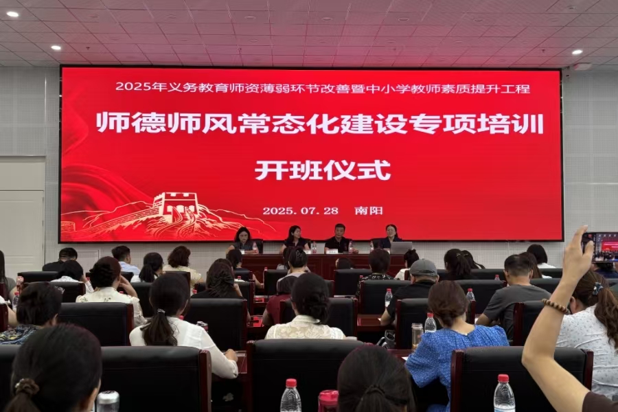 近日,我校教育科学学院举办了2025年师德师风常态化建设专题培训项目,承担了来自安阳,开封,新乡,平顶山4个地市的200名业务骨干的培训。7月28日上午,一场意义非凡的师德师风常态化建设专项培训开班仪式在南阳师范学院西区1楼报告厅隆重举行。本次仪式由培训管理办公室主任王君萌主持,教育科学学院党委书记李晓宏、院长李辉以及培训专干高广骅等领导出席,众多放弃假期休息、积极投身学习的教师同仁参与其中。