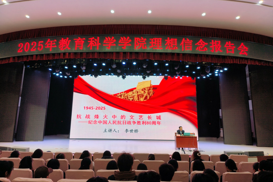 本网讯(通讯员 宋施雨 郭飞 杨心雨/图 付子玉/文)为了加强对同学们的理想信念教育,教育科学科学院于10月23日在中区演播厅召开“《抗战烽火中的文艺长城——纪念中国人民抗日战争胜利80周年》”理想信念报告会。本次会议由教育科学学院党委副书记张瑞雪主持,新闻与传播学院原党委书记李世桥主讲,25级本科全体学生到场参加。