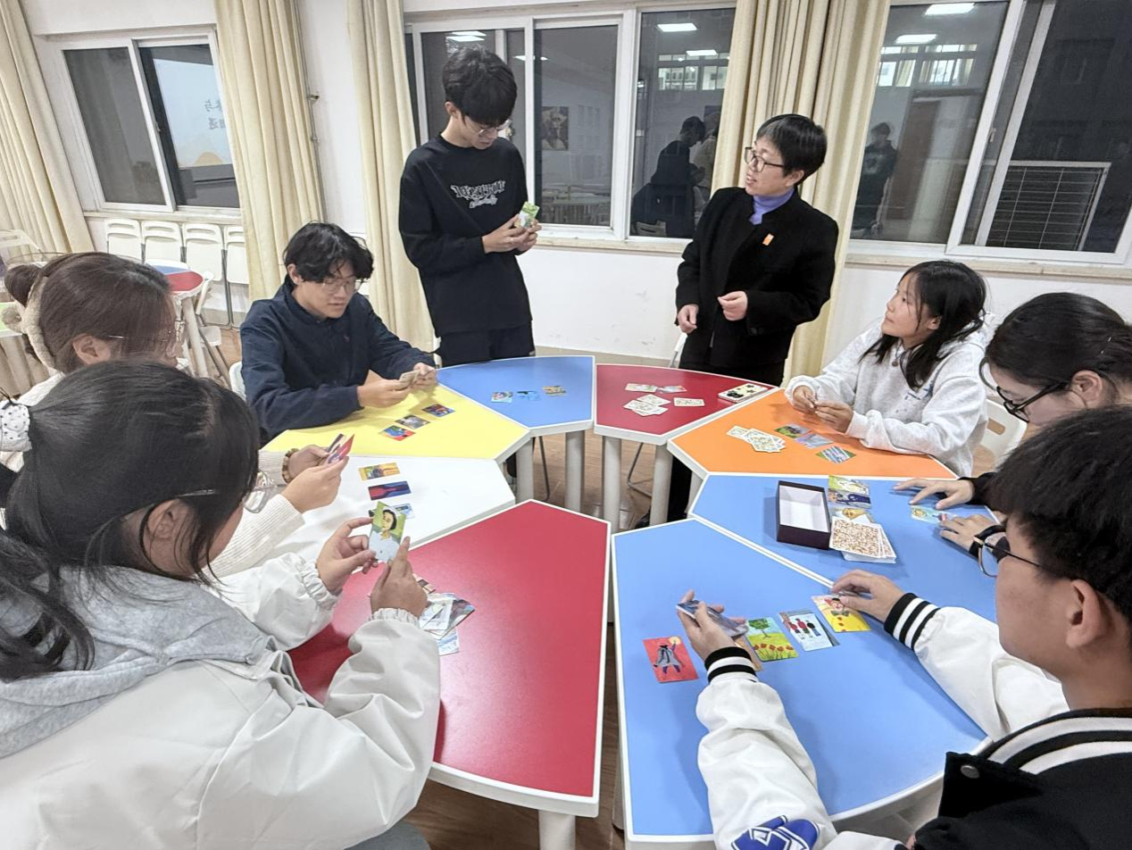 活动在轻松有趣的破冰环节中拉开帷幕。在“初识卡牌:第一印象”环节,同学们凭借抽取的图卡进行自由联想与分享,迅速拉近了彼此的距离。随后的“故事接龙:奇妙的叙事”环节,各小组成员凭借天马行空的想象,将随机抽取的卡牌串联成一个个独特的心灵故事,现场笑声不断,创意涌动,在合作中展现了思维的多样性与包容性。