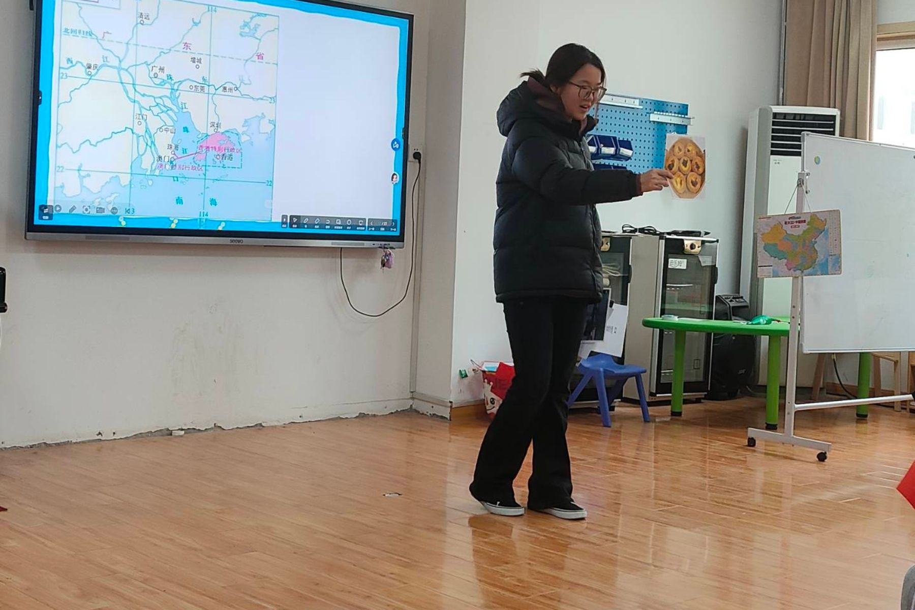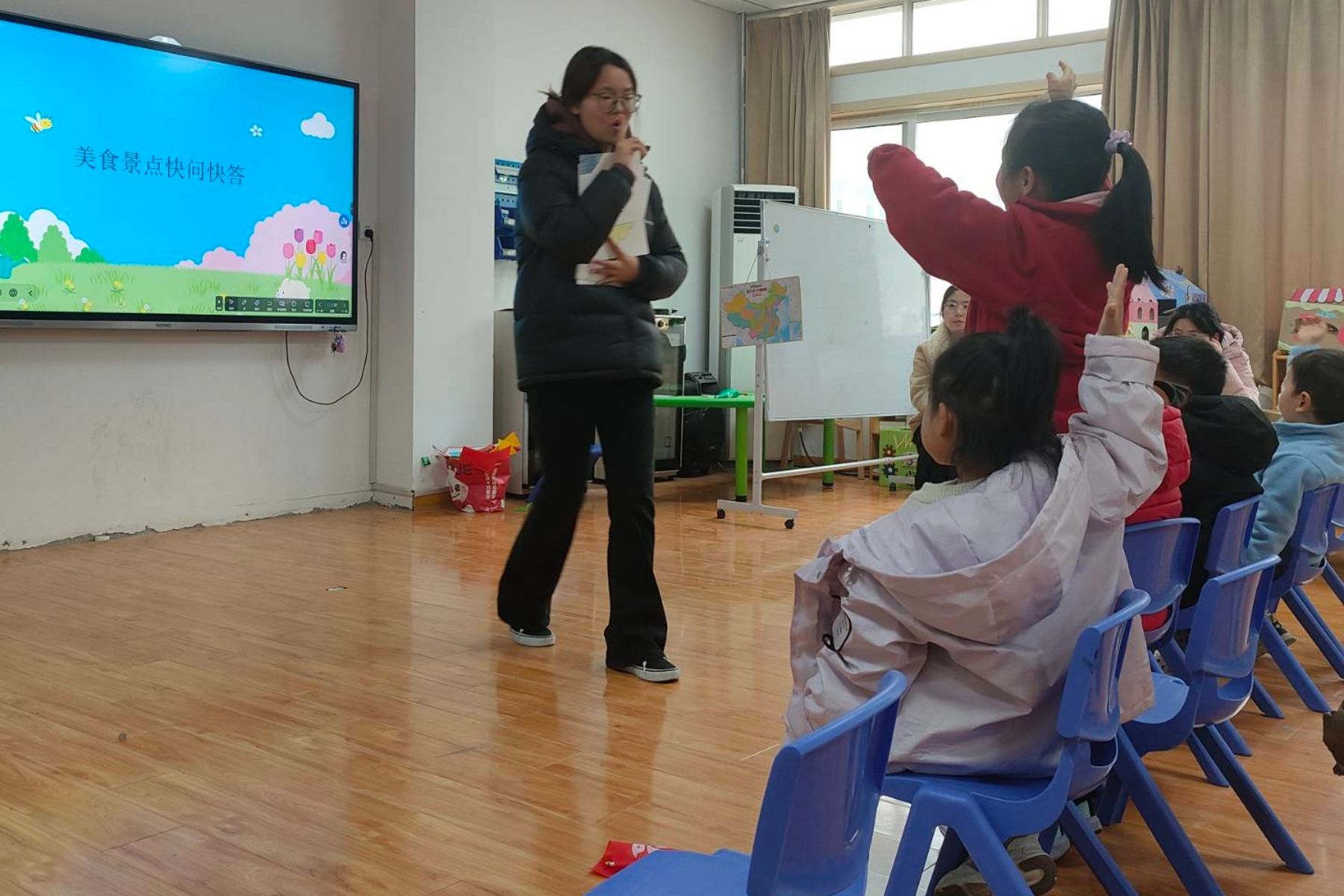 探秘激趣,领略港澳风情。在“港澳美食景点大探秘”环节,周梦阳身“旅行小向导”,通过图片展示、实物观察、手势模仿等方式,带孩子们认识葡式蛋挞、猪扒包、鸡蛋仔等特色美食,领略大三巴、澳门塔、迪士尼乐园、维多利亚港等著名景点的独特魅力。“美食景点找家”配对游戏中,孩子们积极抢答、精准配对,在趣味互动中巩固所学知识,进一步加深对港澳的认知与喜爱。