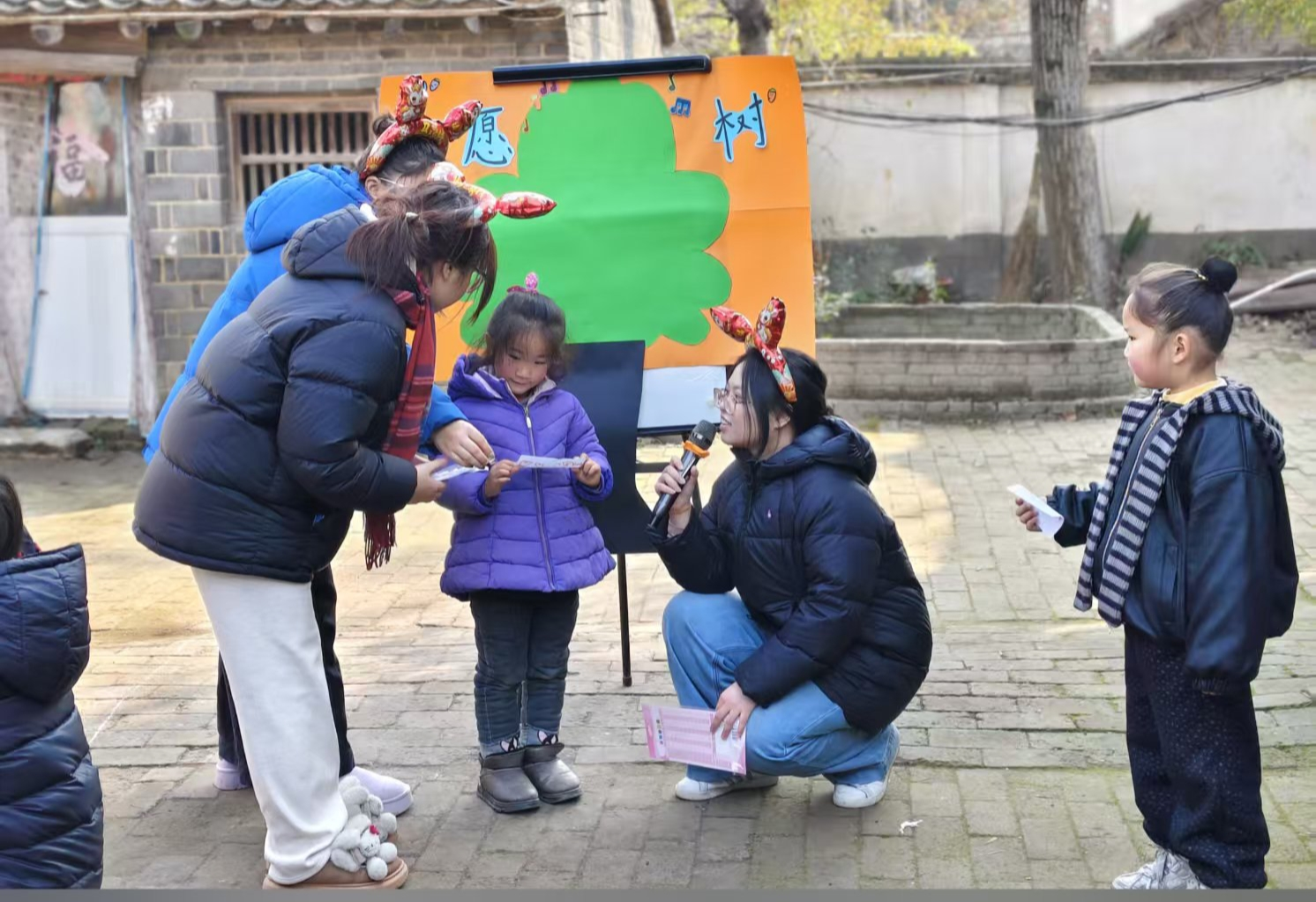 新年心愿树前,孩子们在白纸上画出自己的新年愿望——“爸爸妈妈快些回家”、“穿上好看的新衣服”,小心翼翼地贴在树干上,看着挂满“心愿果实”的大树,孩子们或积极或腼腆地向大家展示自己的新年愿望。