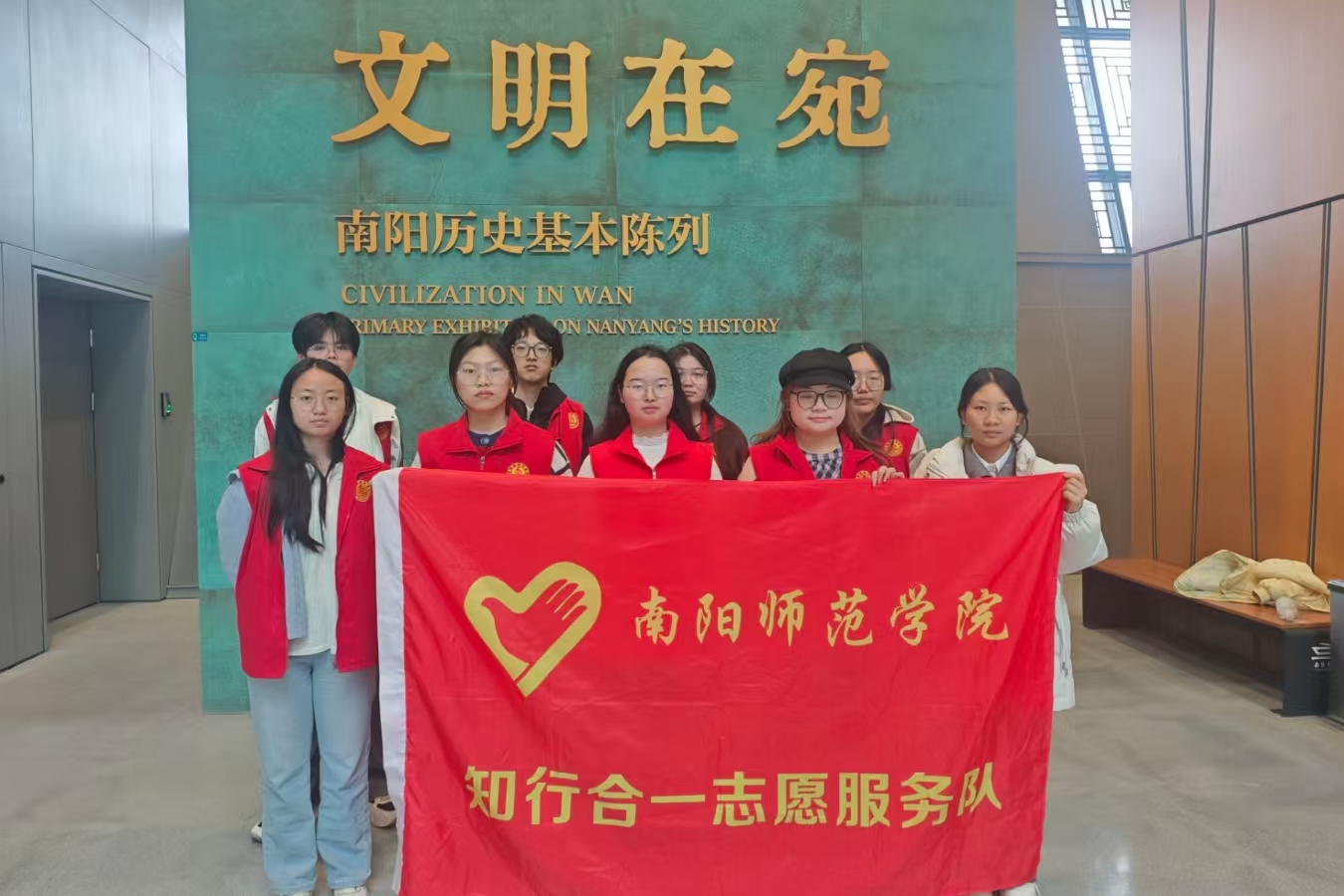 活动伊始,志愿者们在讲解员的带领下有序参观场馆,深入了解南阳悠久的历史脉络与厚重的文化底蕴,近距离感受文物背后的故事与中华优秀传统文化的博大精深。随后,同学们化身场馆志愿者,协助工作人员开展引导观展、维持秩序、文物讲解辅助等工作,将“奉献、友爱、互助、进步”的志愿精神融入实际行动。活动最后,大家围绕本次实践分享感悟、交流心得,进一步凝聚了服务社会、传承文化的青春共识。