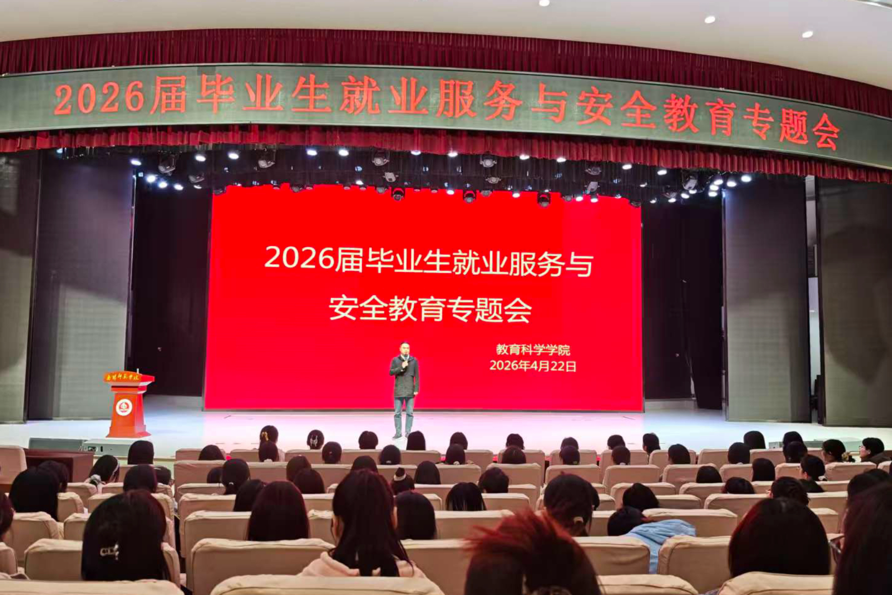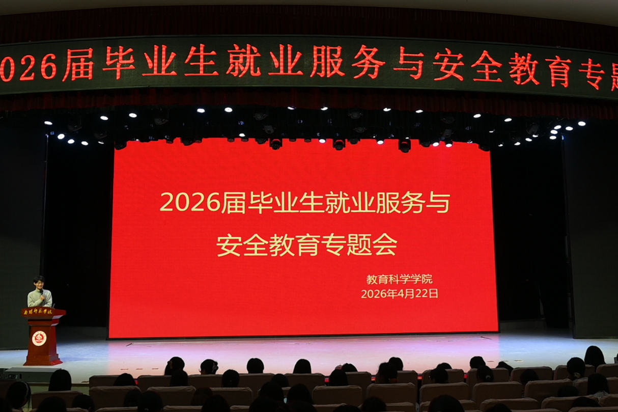 本网讯(通讯员宋施雨 林心语/图 付子玉/文)为扎实推进毕业生管理服务工作,引导毕业生合理规划未来发展,文明有序离校,教育科学学院于4月22日在中区演播厅召开2026届毕业生就业服务与安全教育主题班会。本次班会由辅导员卢浦主持,副书记佘清和全体辅导员参加,2026届毕业生参会。