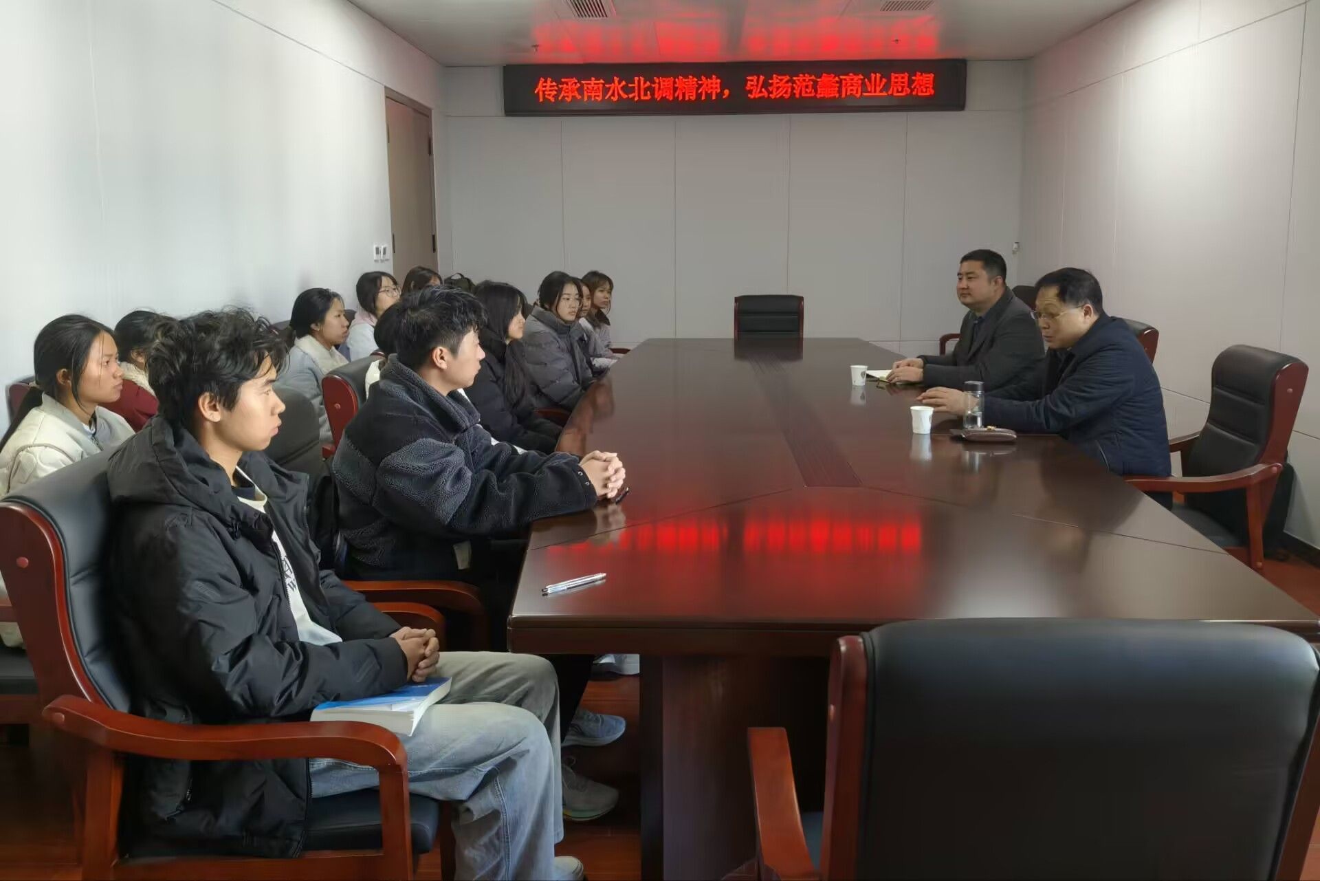 会上,王传飞向参会成员介绍主讲嘉宾,并代表学院致以诚挚欢迎。随后,梁海磊结合自身在区域文化与商业伦理领域的研究积淀,深入解读了南水北调精神与范蠡商业思想的时代内涵。最后,研讨会进入互动交流环节,梁海磊与大一学子围绕“精神传承如何融入基础学业”“范蠡思想对经管专业入门的启发”“大学初期职业认知构建”等问题展开交流,逐一回应新生疑问,助力明确学业方向,深化主题理解。