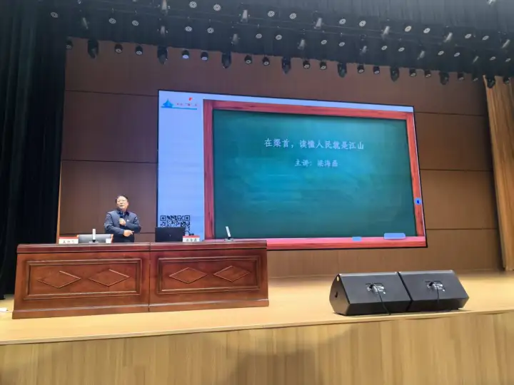 活动中,梁海磊教授以《在渠首,读懂人民就是江山》为题展开宣讲,围绕习近平总书记的光辉思想、共产党的人民情怀、老百姓的家国情怀三个维度,深入解读了南水北调工程的来龙去脉,生动讲述了工程建设中移民群众的无私奉献故事,并阐释了南水北调精神的时代价值,让在场同学深刻感受到“人民至上”的理念与大国工程背后的民生温度。王传飞作总结发言,寄语同学们将本次宣讲内容内化于心、外化于行,以实干践行使命,用青春之力助力强国建设、民族复兴伟业。