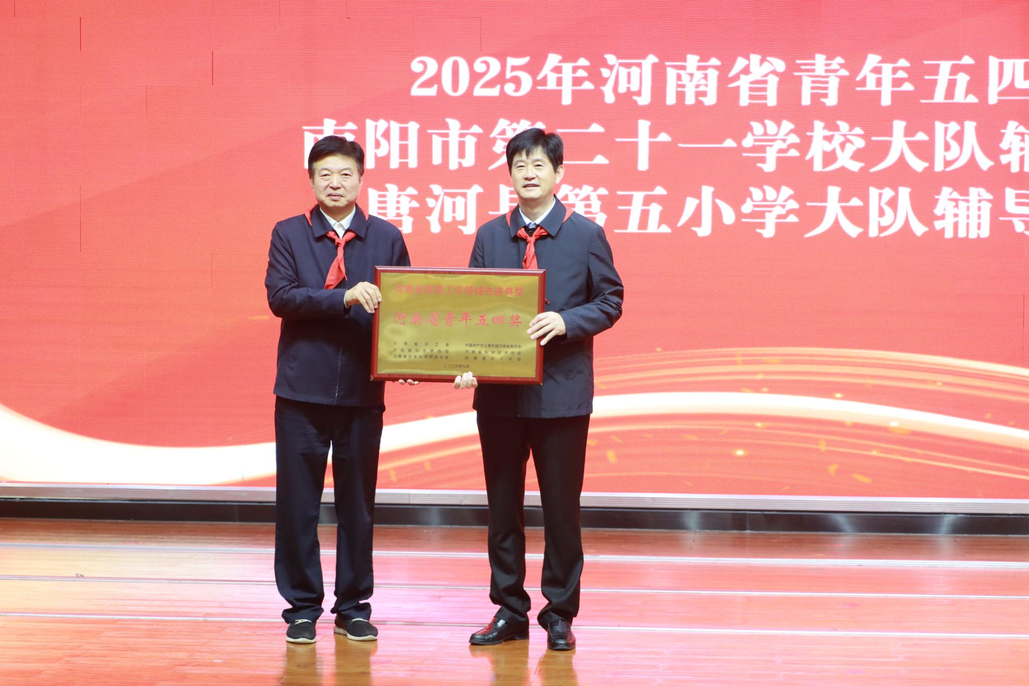 随后,刘永国为荣获2025年河南省青年五四奖先进个人和先进集体的代表颁奖。李冬冬为我院党委副书记、关工委副主任王传飞等6人颁发少先队校外辅导员聘书。最后,市第十五小学等单位师生员工进行主题队会展示。