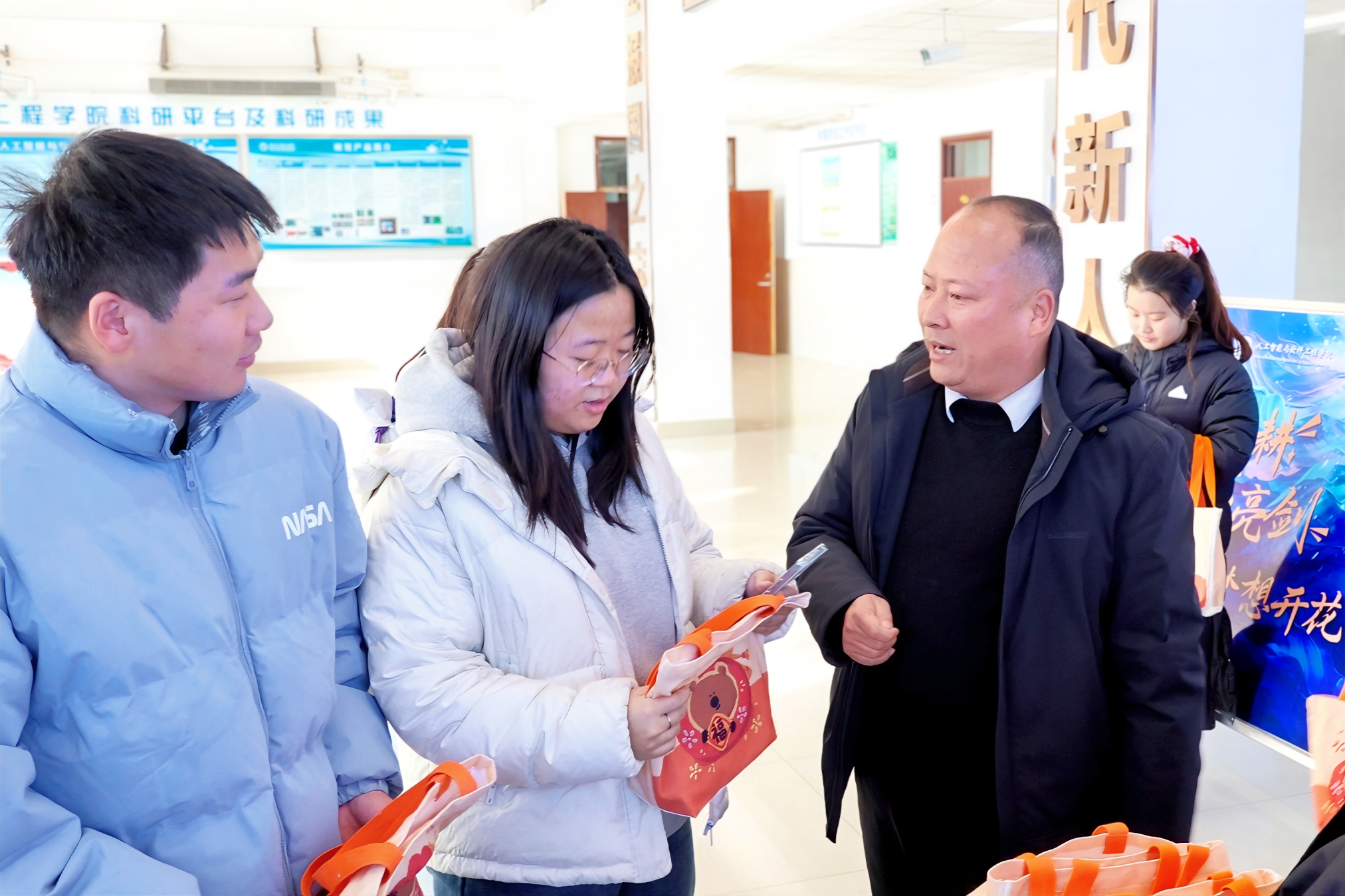本网讯(通讯员 徐子铭 庆紫涵/文 刘朔浦/图)为传递对考研学子深切关怀,护航考研冲刺,助力学子圆梦,12月16日至18日,人工智能与软件工程学院于西区张衡楼为考研学子发放暖心礼包。学院党委书记马晓普、院长惠明、党委副书记朱书玉来到活动现场,与志愿者们一起发放礼包。