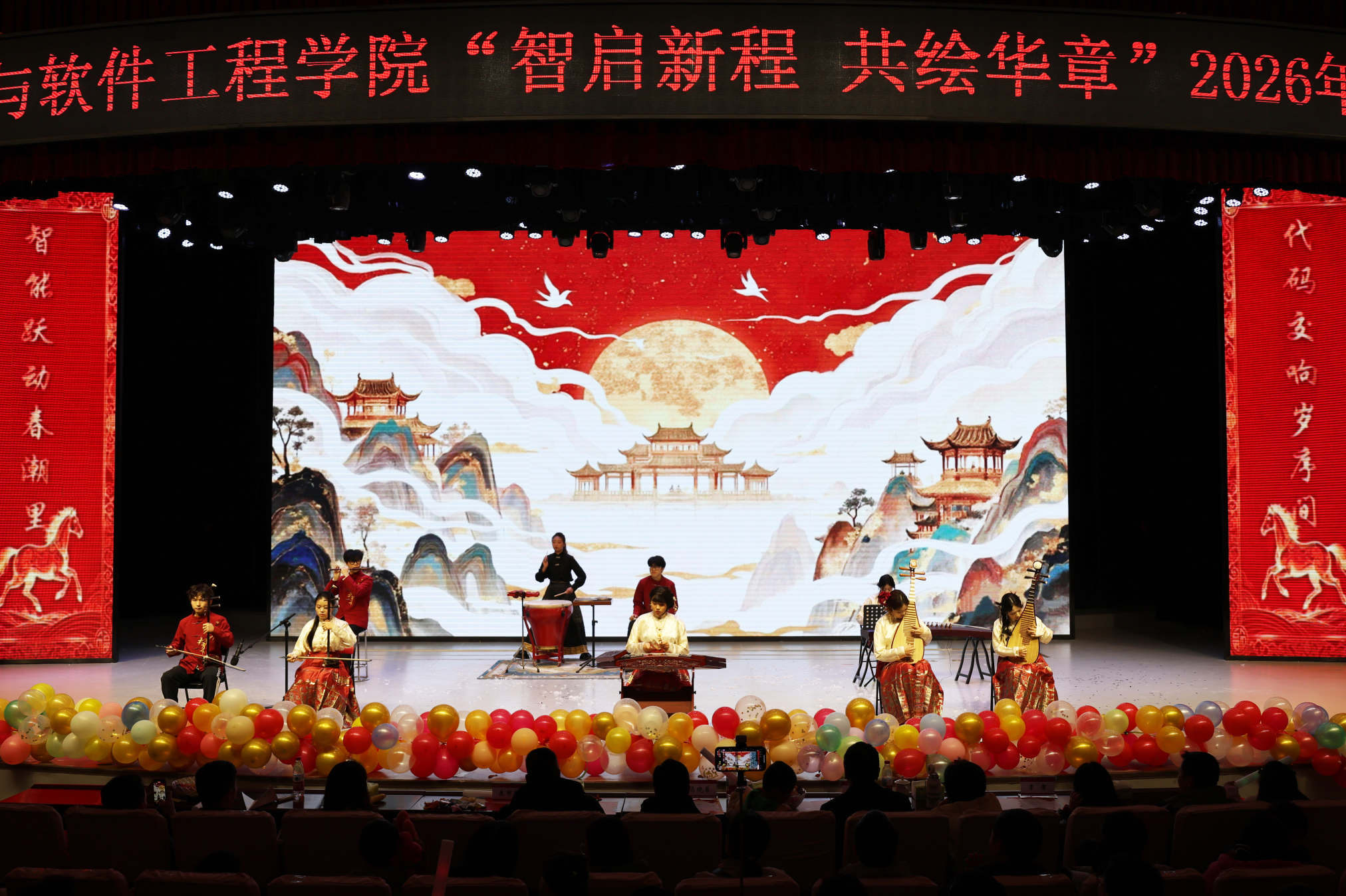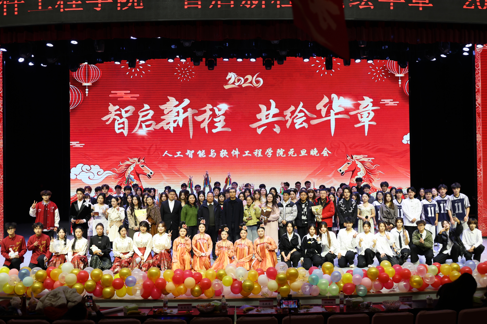 本网讯(通讯员 郭康达 苑子恒/文 梁艺凡/图)岁序更迭启新篇,青春奋进绘华章。12月26日晚,人工智能与软件工程学院2026年“智启新程,共绘华章”元旦晚会在中区演播厅举办。学院领导班子与五百余名师生欢聚一堂,共同观赏节目演出。
