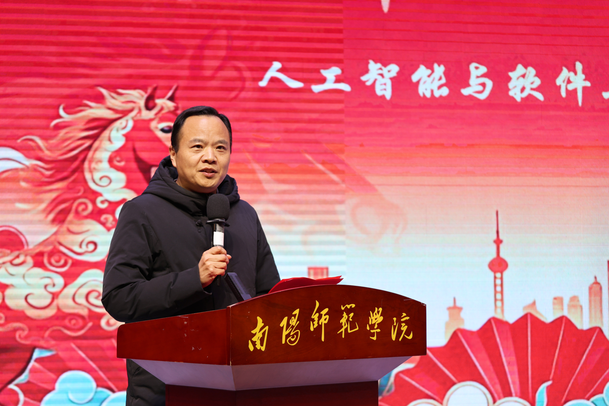 学院党委书记马晓普致辞,向全体师生致以新年的美好祝福,并回顾了学院2025年在教学改革、科研创新和人才培养等方面取得的成效,号召全体师生在新的一年里同心同行,再创佳绩。