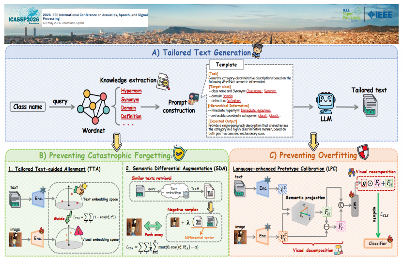 (通讯员 黄鑫)近日,人工智能学院大数据与人工智能团队与华北电力大学的合作研究成果《Tailored Text Integration and Semantic Differential Enhancement for Few-Shot Class-Incremental Learning》被国际学术会议ICASSP 2026录用。论文第一作者为我校黄鑫博士,第二作者为我校硕士研究生王世龙,通讯作者为我校袁直敏博士,南阳师范学院为第一通讯单位。