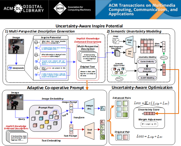 本网讯(通讯员 黄鑫)近日,人工智能学院大数据与人工智能团队与北京大学、华北电力大学的合作研究成果《Adaptive Co-operative Prompting and Uncertainty-Aware Implicit Knowledge Enhancement for Cross-Modal Retrieval 》被国际期刊ACM Transactions on Multimedia Computing, Communications, and Applications (TOMM)录用。论文第一作者为我校黄鑫博士,第二作者为我校硕士研究生王世龙,通讯作者为我校李菁菁博士,南阳师范学院为第一通讯单位。TOMM是国际计算机学会(ACM)出版的 Transactions 系列期刊,其JCR分区为Q1,是多媒体领域的顶级国际期刊,也是中国计算机学会(CCF)推荐的B类国际期刊。